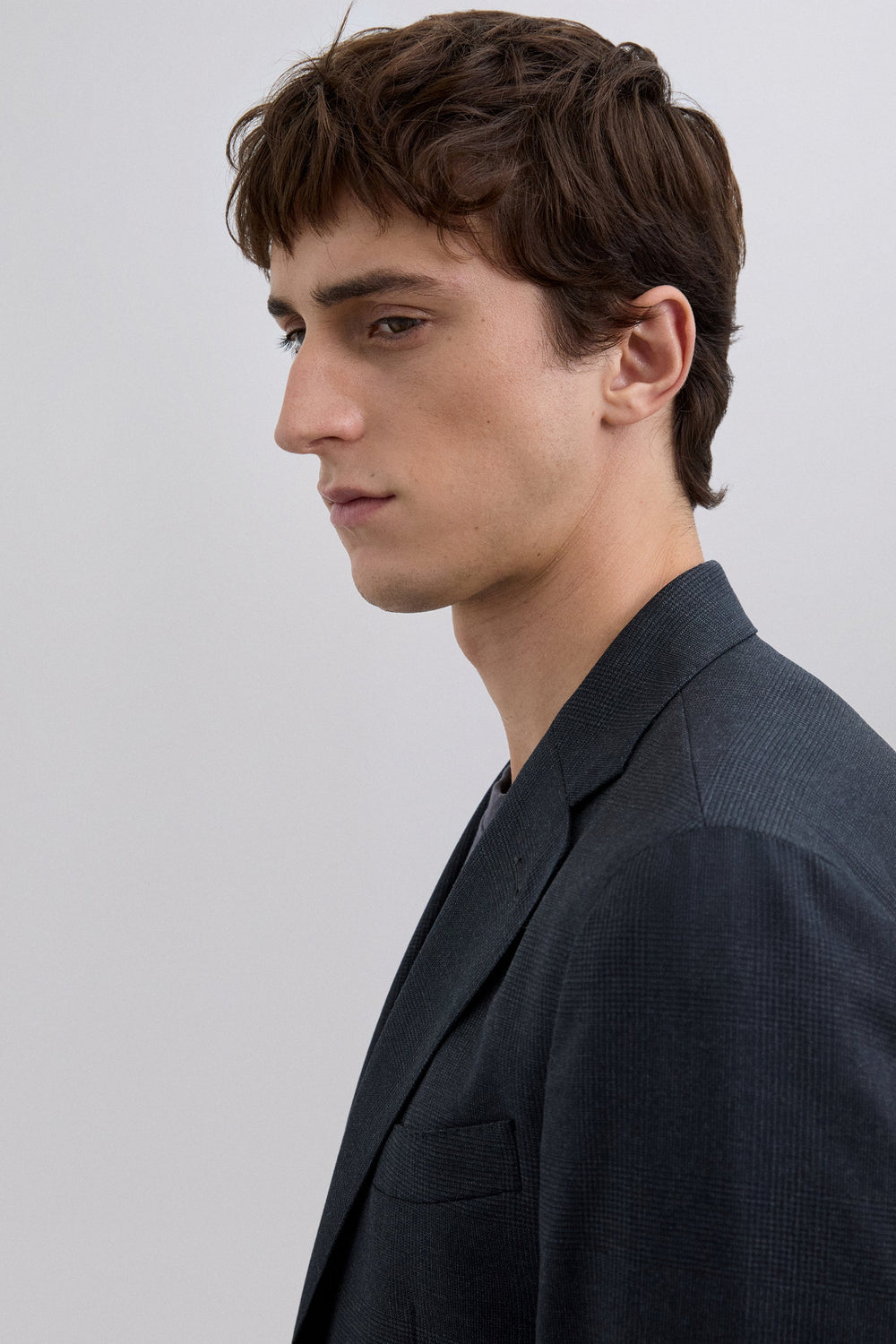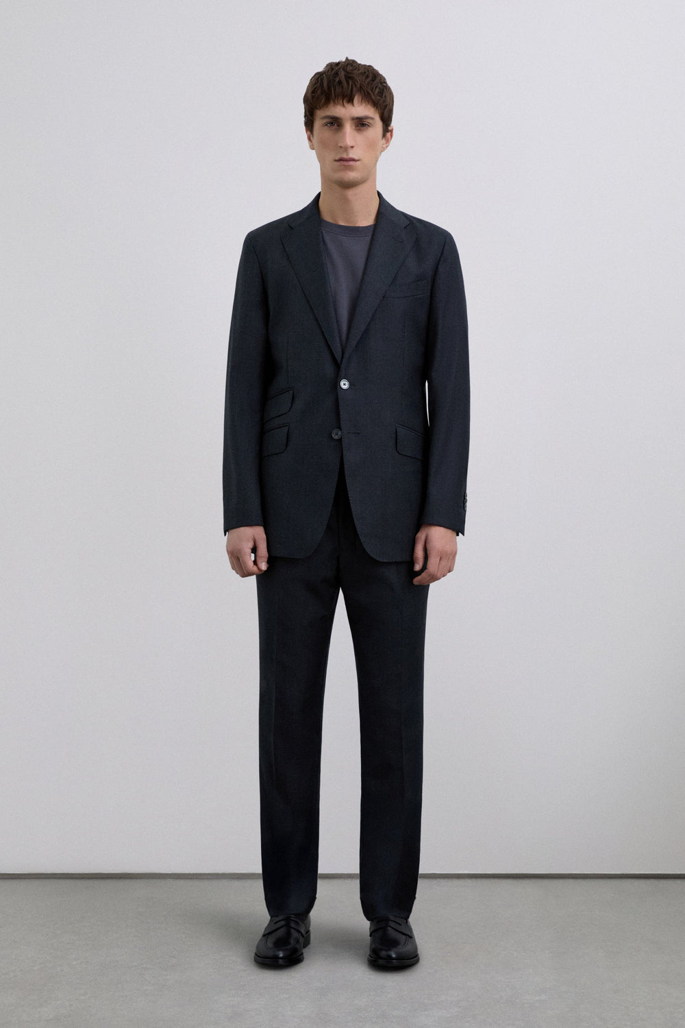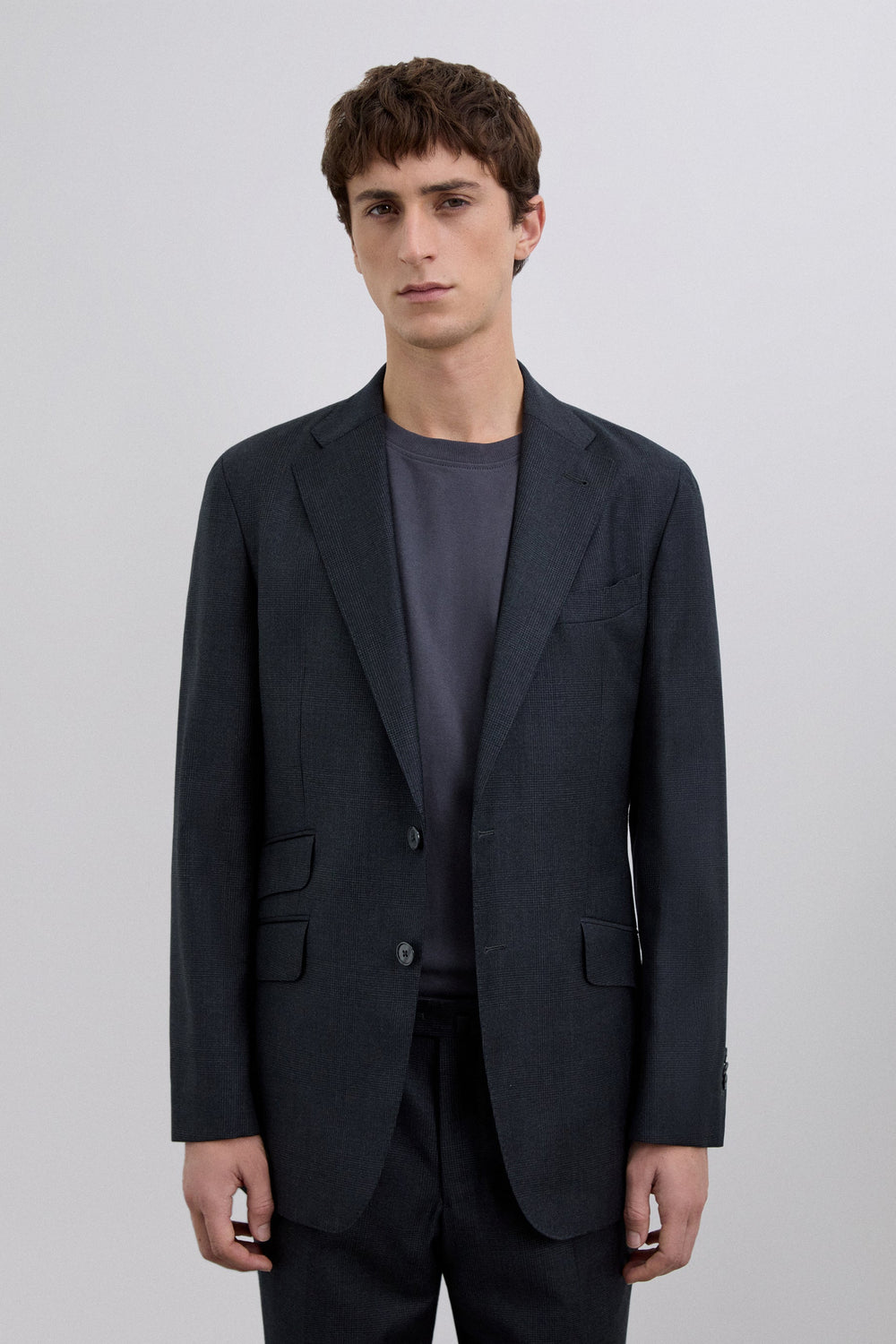 Blazer made of 100% wool. Regular lapels. Chest pocket with piping. Three slanted flap pockets. Two button fastening at the front.