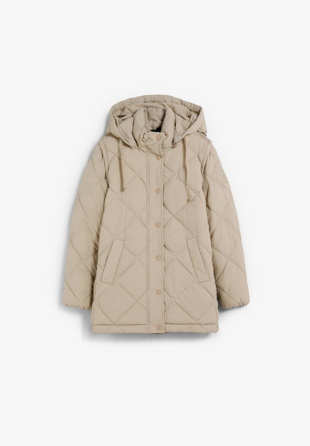 Padded coat. Detachable hood and sleeves. Front zip fastening concealed by placket with press stud fastening. Side pockets. Recycled fleece lining. Logo detail on the back.