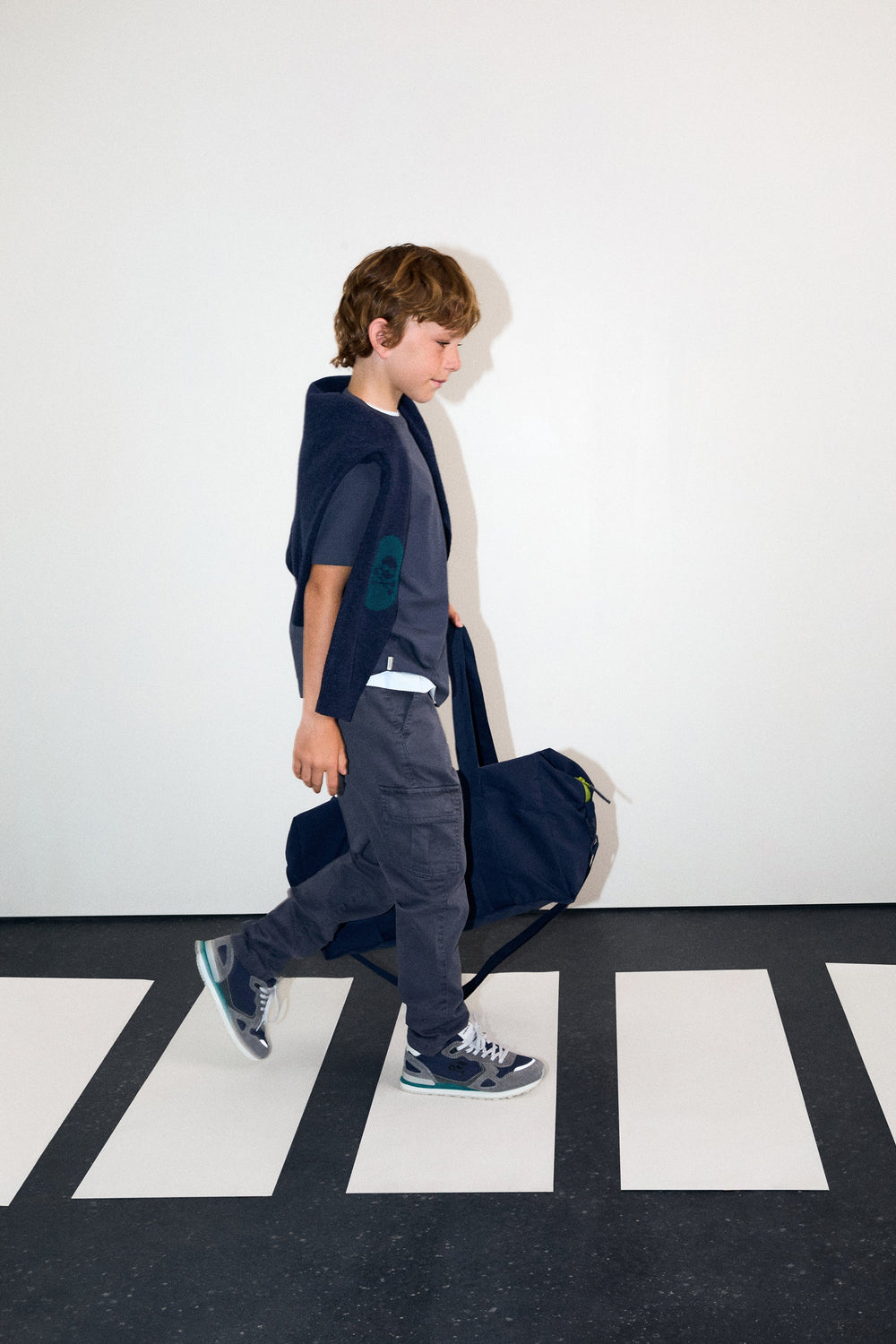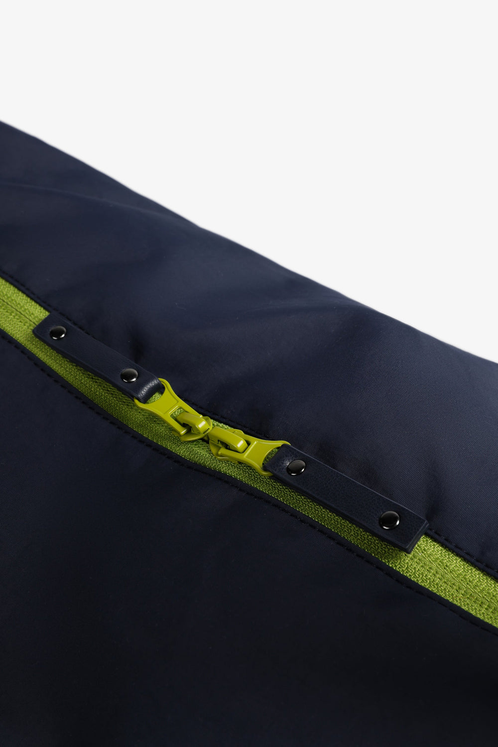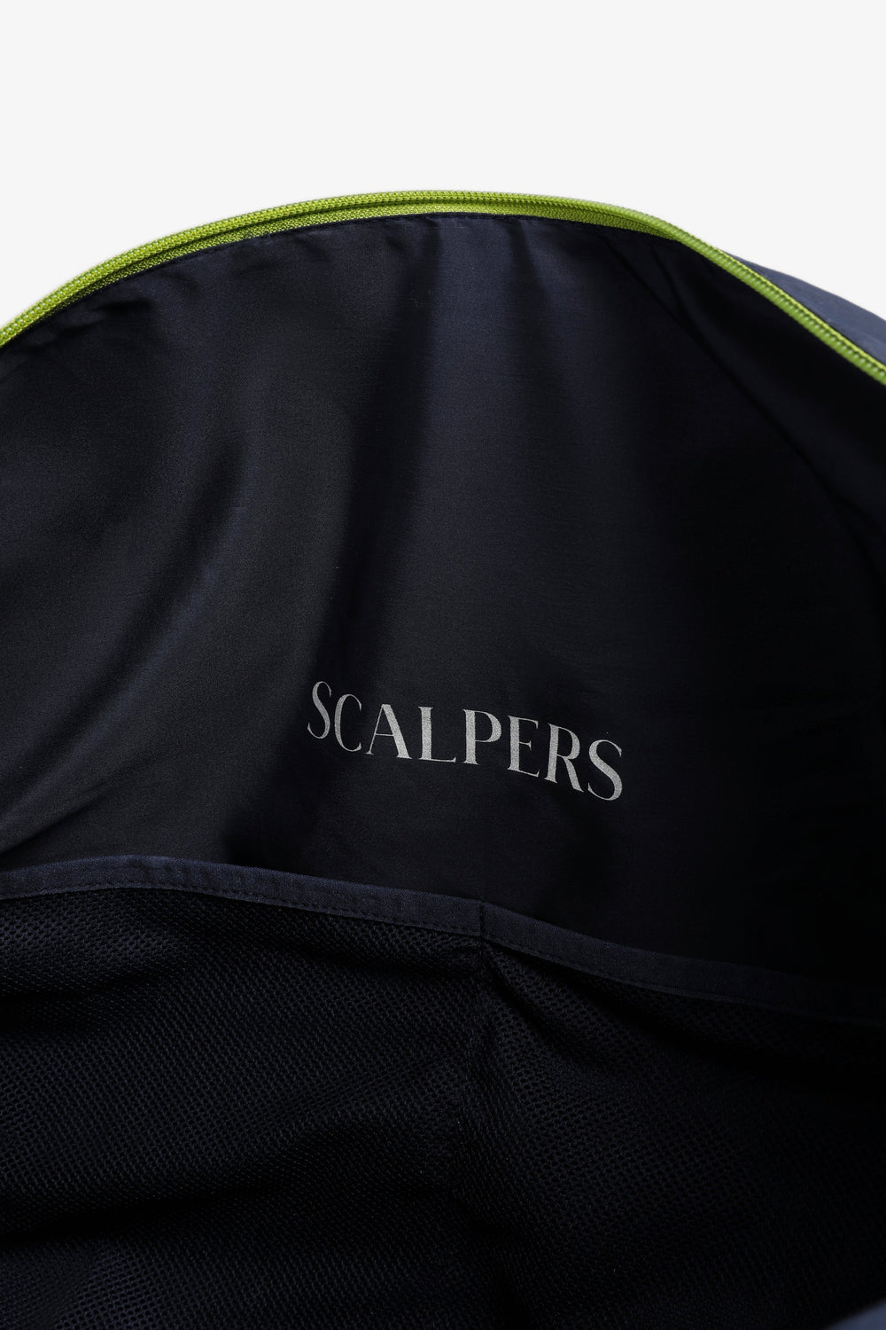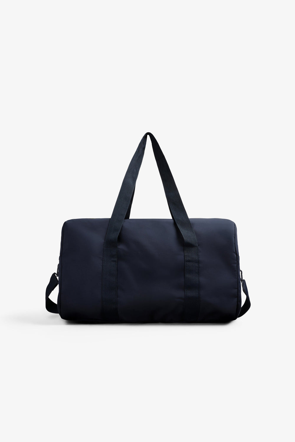 Bag made of a technical fabric. Main and side compartments with zip closure. Zip fastening, short handles and long detachable strap. Front logo and skull print.