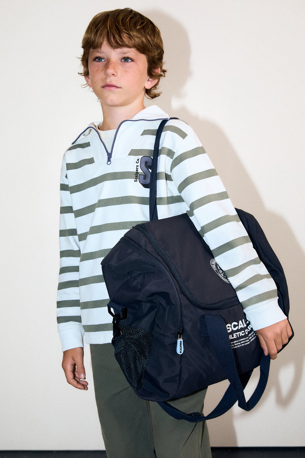 Bag made of a technical fabric. Main compartment with zip closure. One side pocket with zip. Short main shoulder strap and long detachable strap. Front logo and skull print. Logo detail on zip.