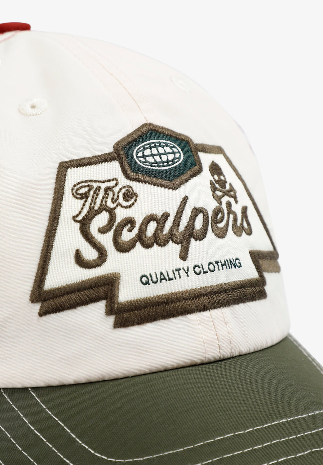 Three-tone cap made of 100% nylon. Adjustable back and front embroidered print with contrast skull. Logo label detail at the back.