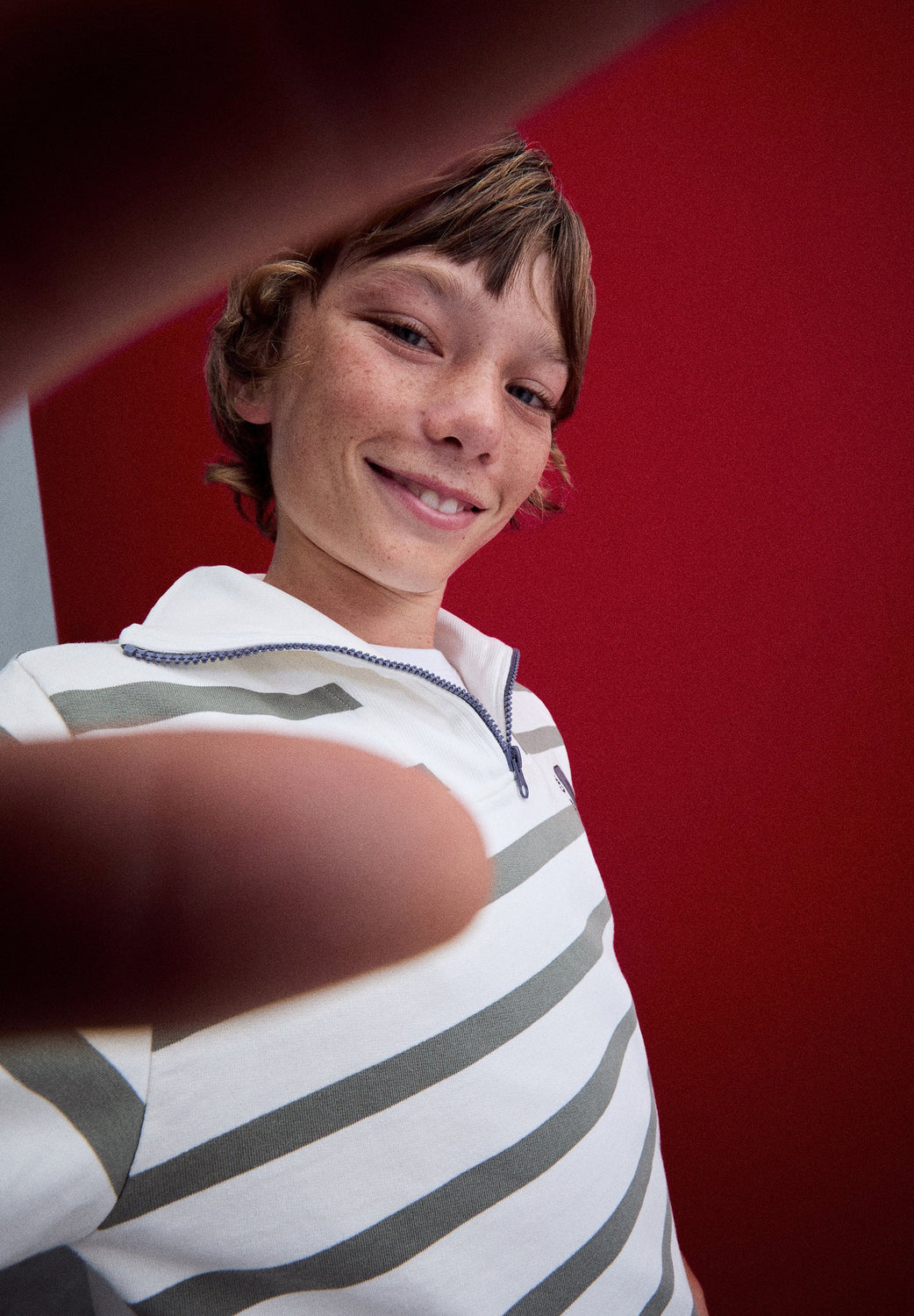 Striped sweatshirt made of 100% BCI cotton. Polo collar with half zip. Regular fit. Long sleeves. Two front pockets. Logo print on chest and contrast embroidered skull on back.