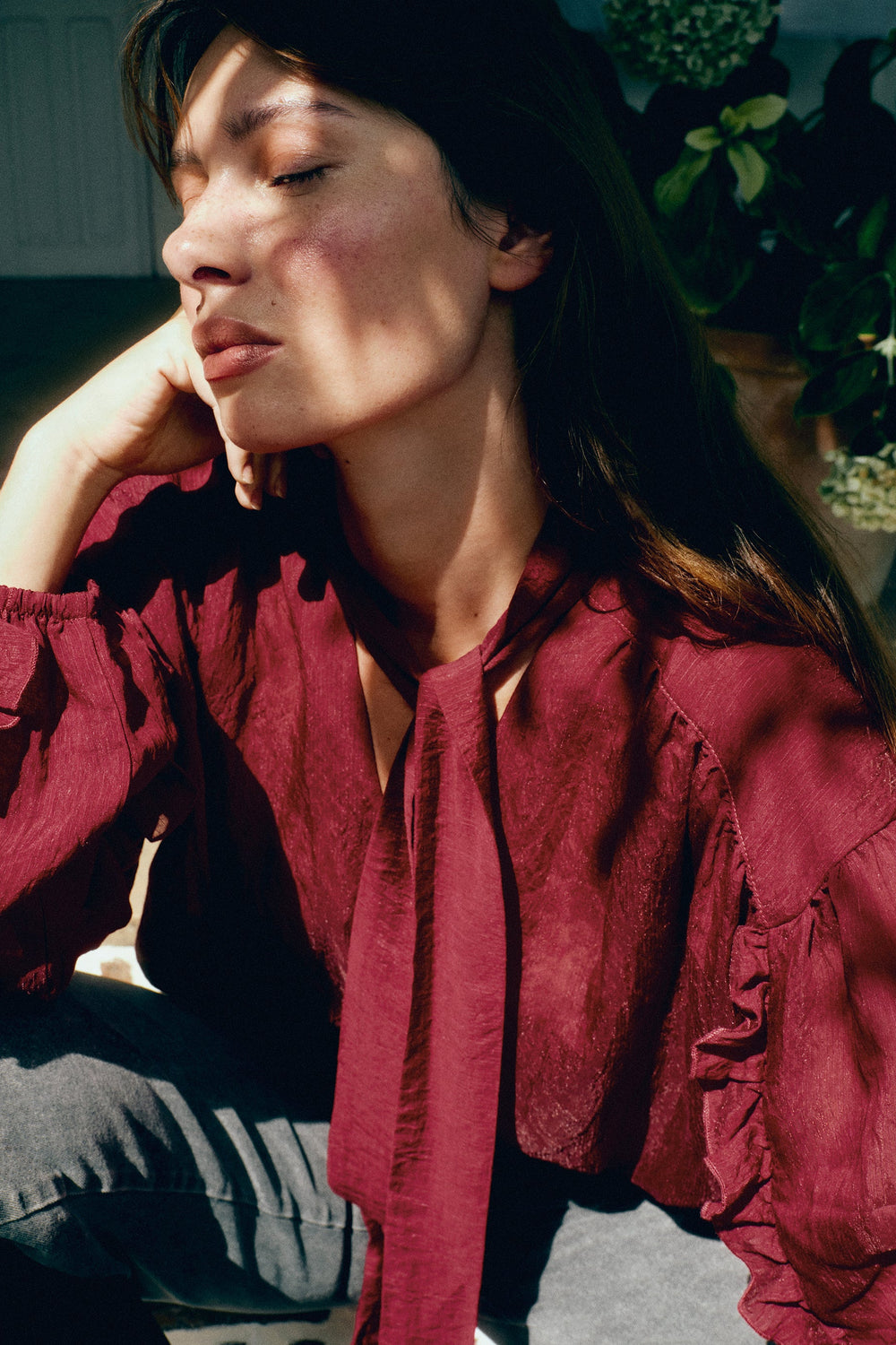 Blouse made of flowing fabric with linen and rayon. Regular Fit. Neckline with tie detail. Front button fastening. Long slightly puffed sleeves with cuffs. Ruffle detailing on the sleeves.