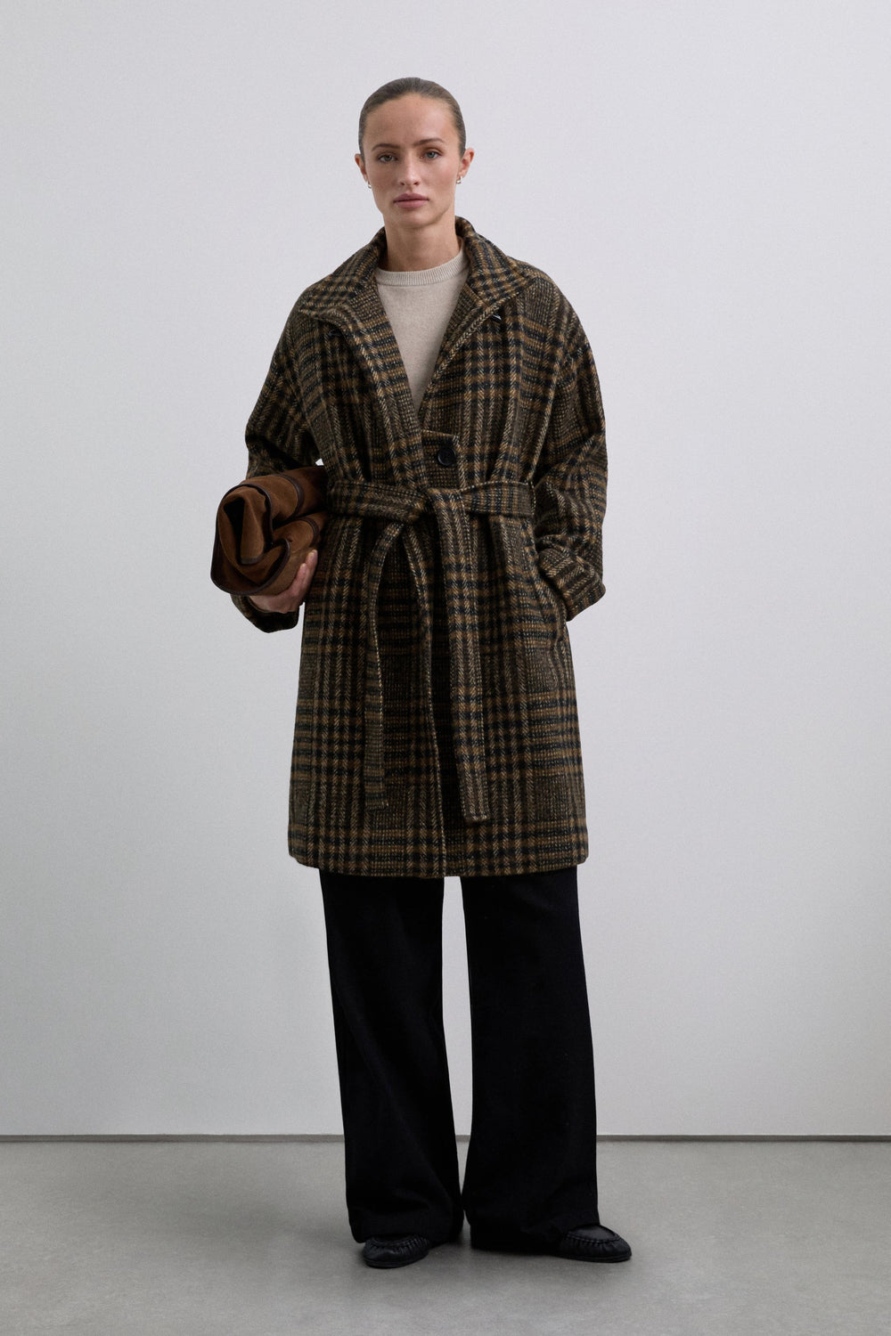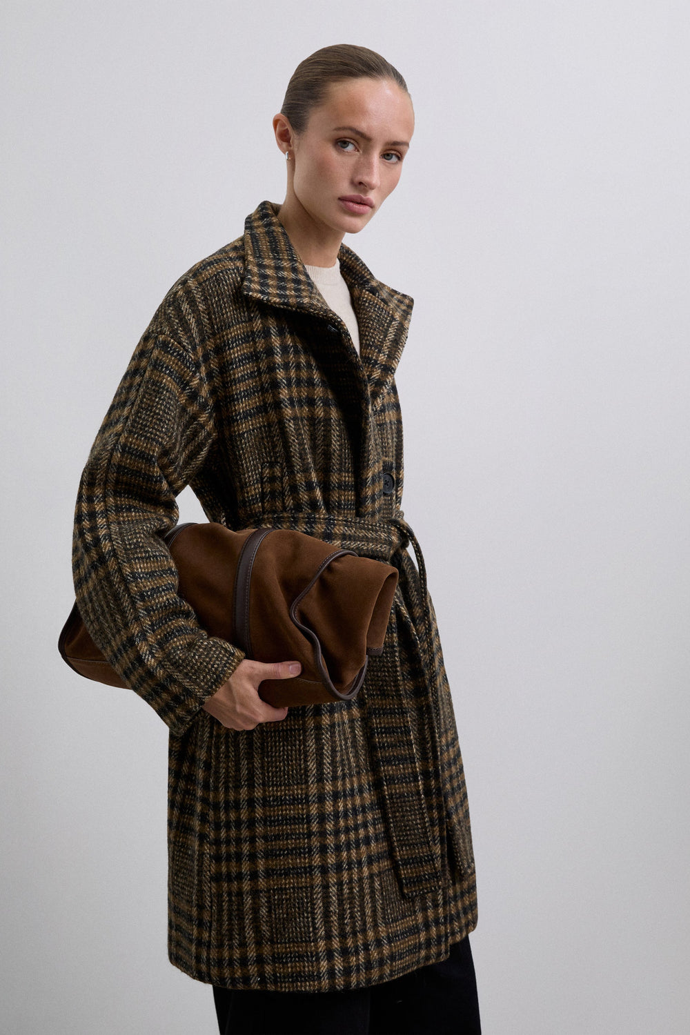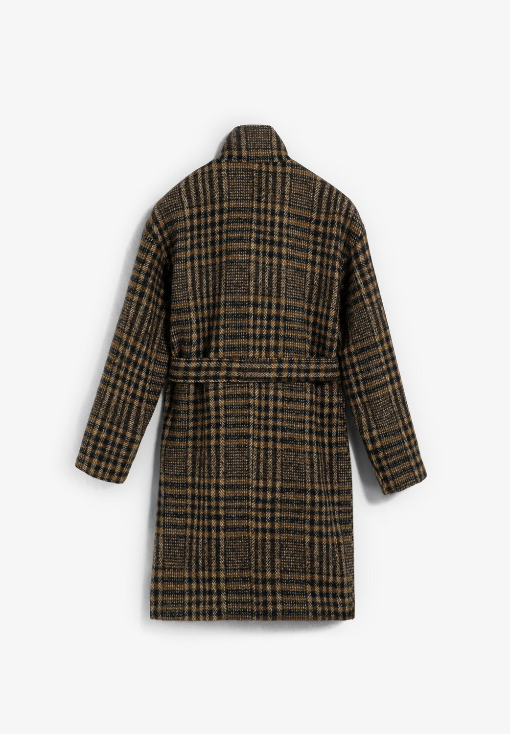 Shirt check print coat made of wool. High collar. Toggle style button at the top. Inner fastening with 2 buttons and outer fastening with adjustable belt. Long sleeves with turn-back cuffs.