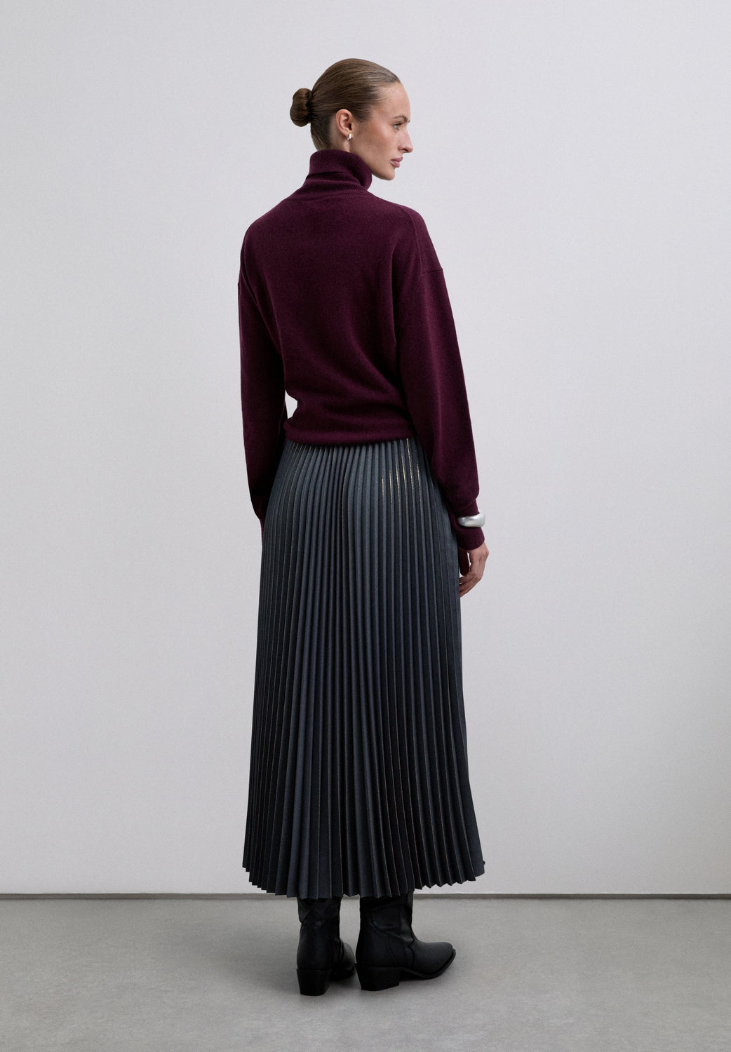 Pleated midi skirt made of flowing fabric with lurex details on the pleats. Regular fit. Elasticated waistband. Slightly A Line.