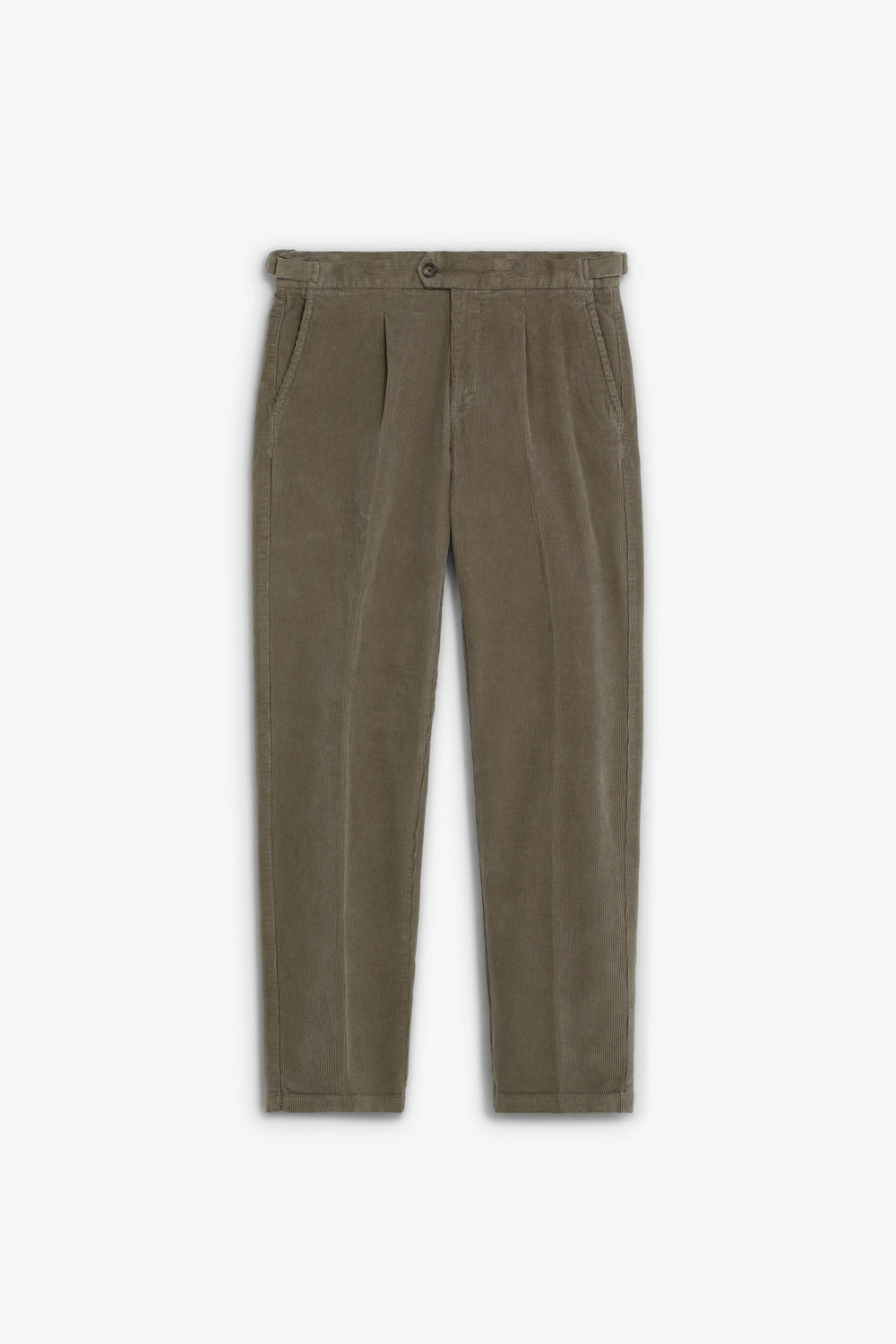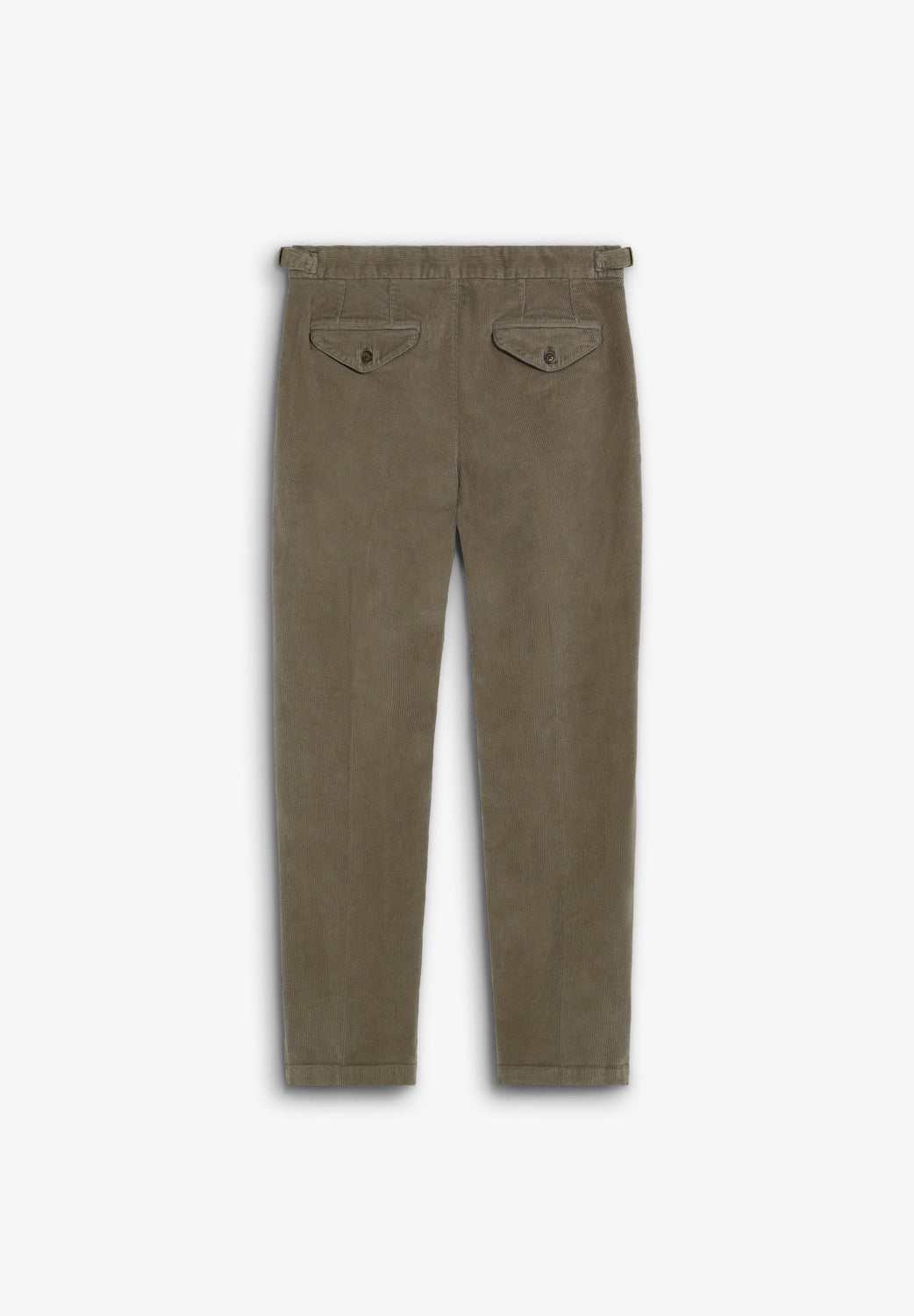 Darted corduroy trousers made of BCI cotton. Slim fit. Metal adjusters on the sides of the waistband; button and zip fastening. Two front pockets and two buttoned back pockets.