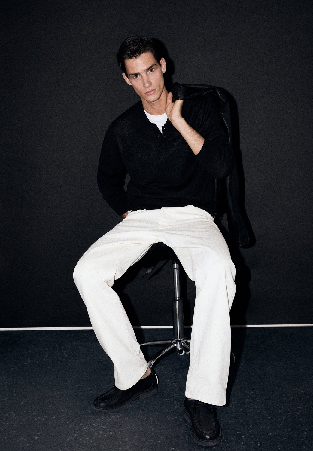Sweater made of 100% wool. Long sleeves. Polo shirt collar. Button fastening.