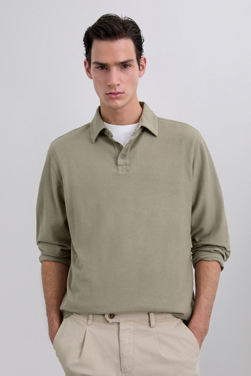 Long sleeved knit polo shirt. Made of a slightly stretch cotton and linen blend fabric. Polo shirt collar with buttons. Button fastening on sleeve.