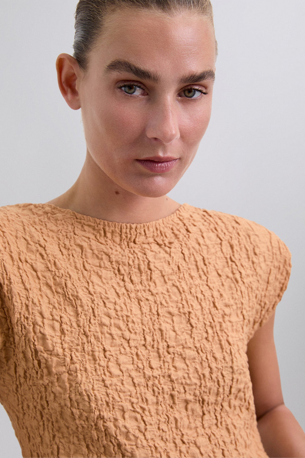 T-shirt made of slightly stretchy cotton blend fabric with crinkle texture. Slim fit, round neck, short sleeves with slightly padded shoulders.
