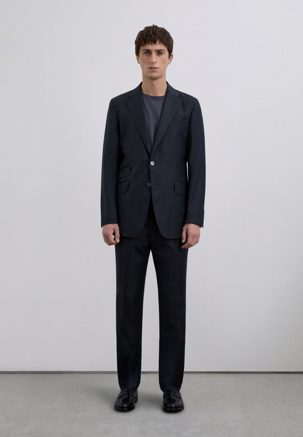 Blazer made of 100% wool. Regular lapels. Chest pocket with piping. Three slanted flap pockets. Two button fastening at the front.
