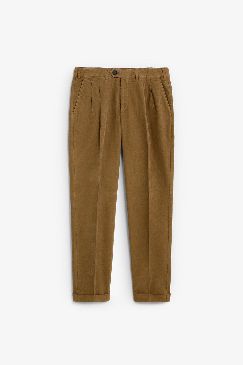 Chino trousers made from corduroy. Loose Fit cut with darts. Concealed zip fastening with an extended button at the waist. Side and back pockets.