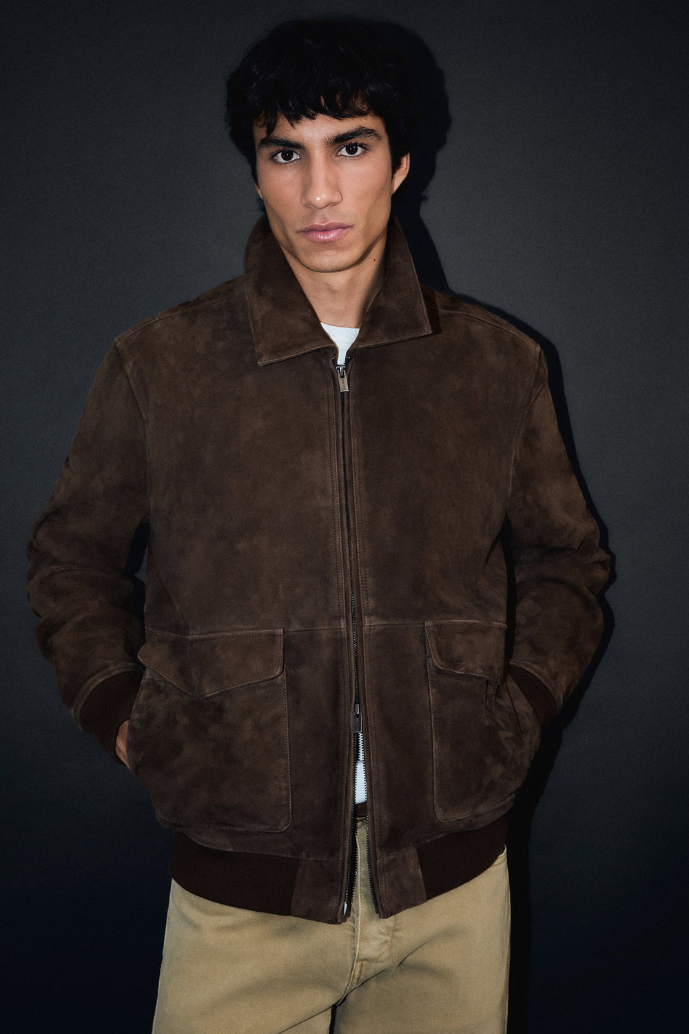Suede jacket with shirt collar. Double front zip fastening. Ribbed cuffs and hem. Two front pockets with flap fastening.