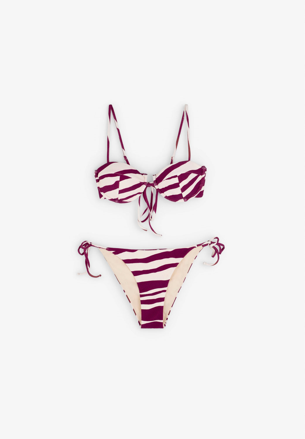 This bikini is designed in collaboration with Scalpers and belongs to the ROBIN x SCALPERS collection. This is a Balconette Bikini with an animal print in purple on a textured ecru background. It has a detachable underwire and foam pads, thin strap neckline, adjustable straps and lace-up back fastening. Fully lined Brazilian bottom.