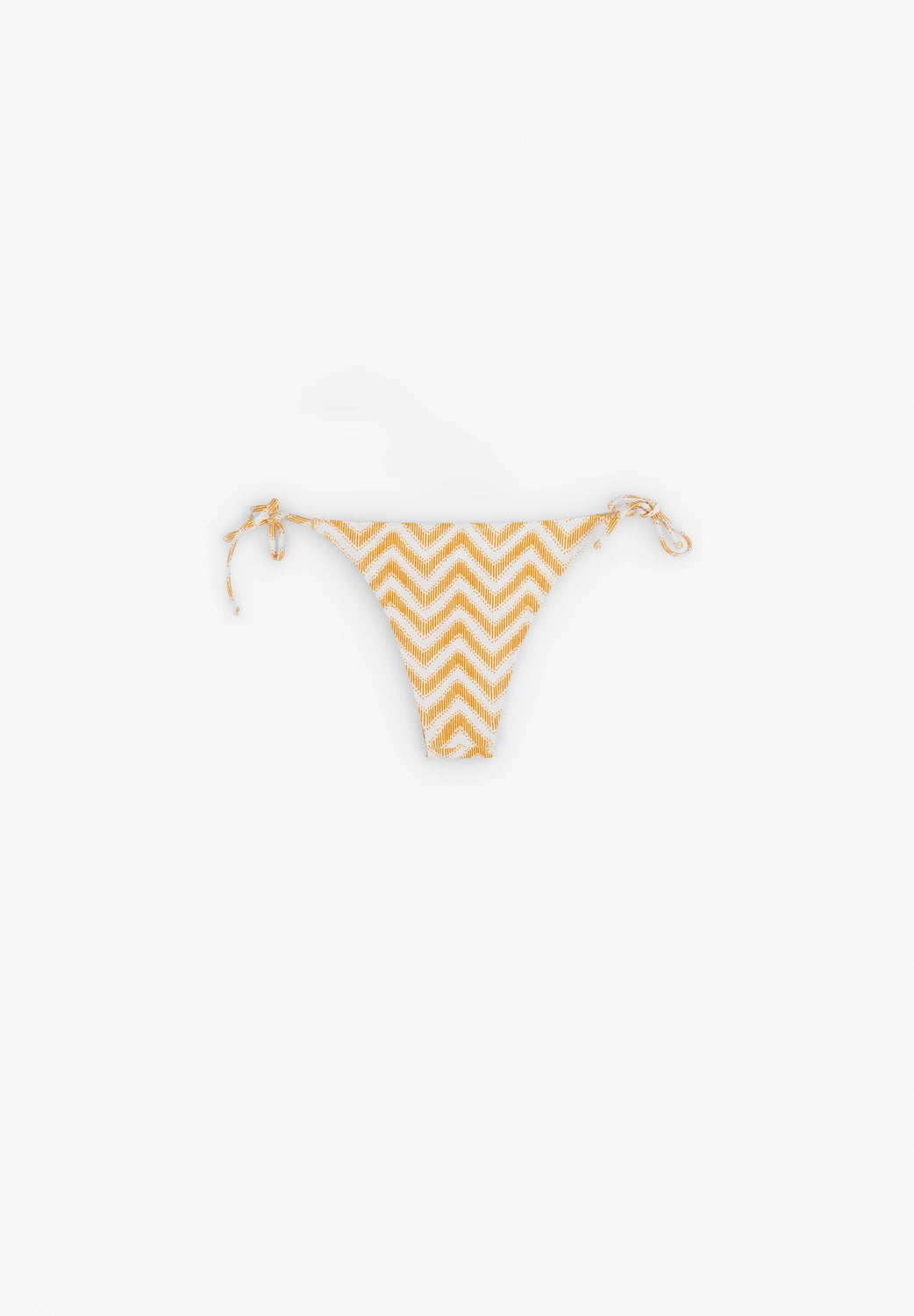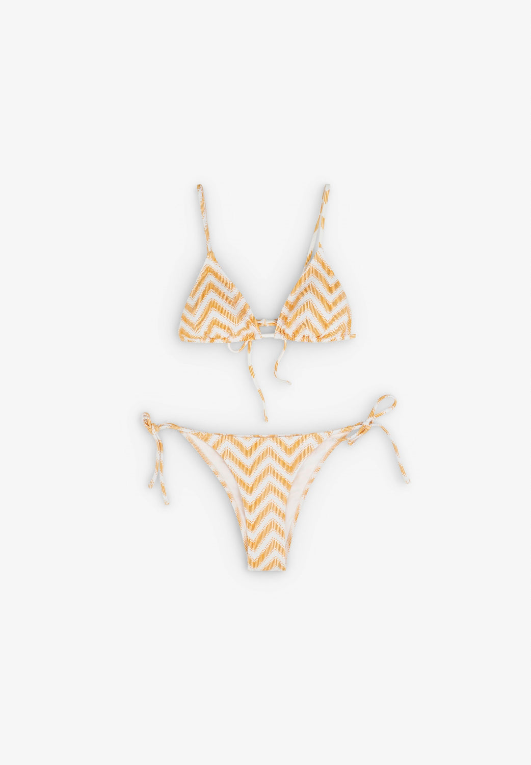 This bikini is designed in collaboration with Scalpers and belongs to the ROBIN x SCALPERS collection. This is a curtain bikini with a yellow zig zag ethnic print on a textured ecru background. It has removable foam pads, knotted at the neck or back for greater comfort. Bottom with classic coverage and side ties, fully lined.