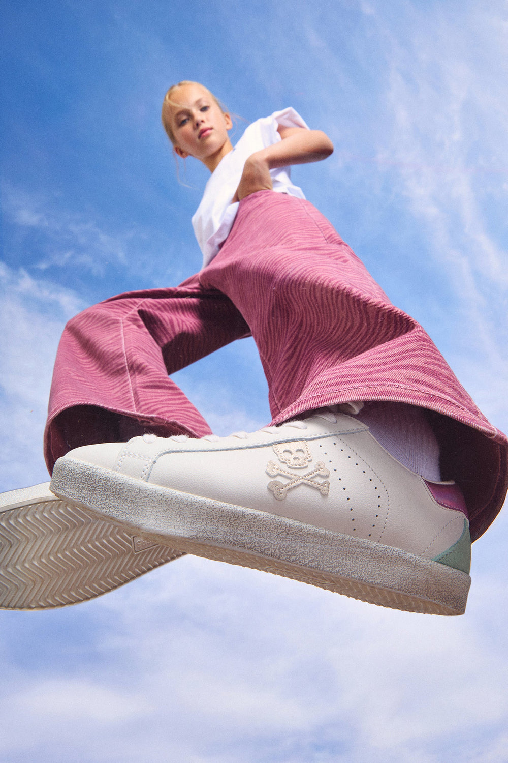 Sneakers with contrast side skull. Worn effect rubber sole. Contrasting heel with matching logo. Lace-up fastening.