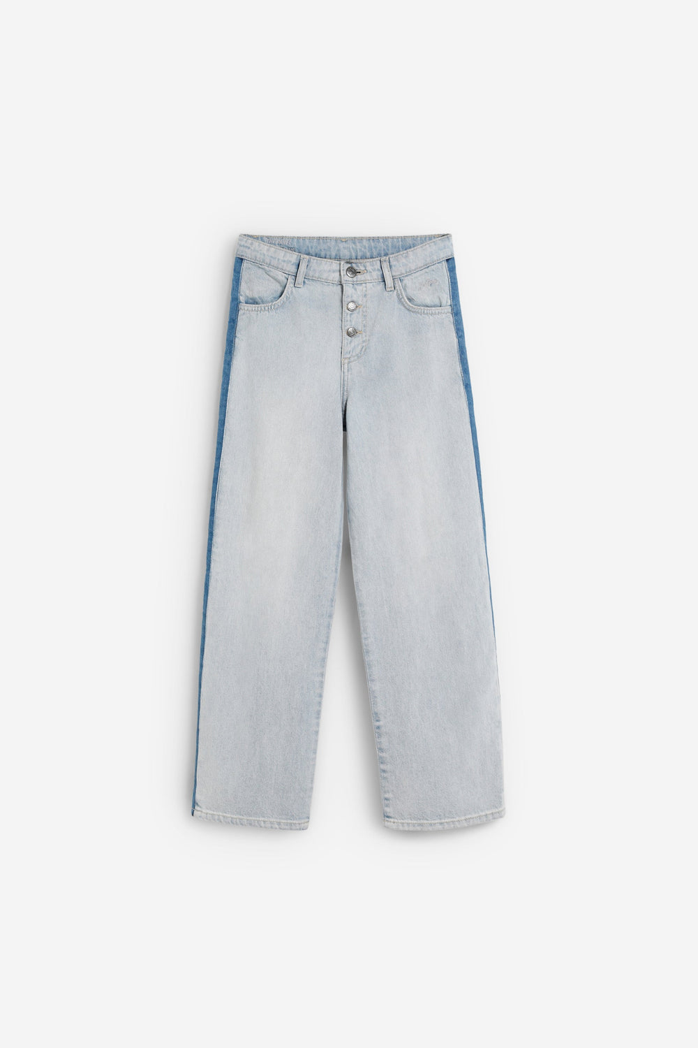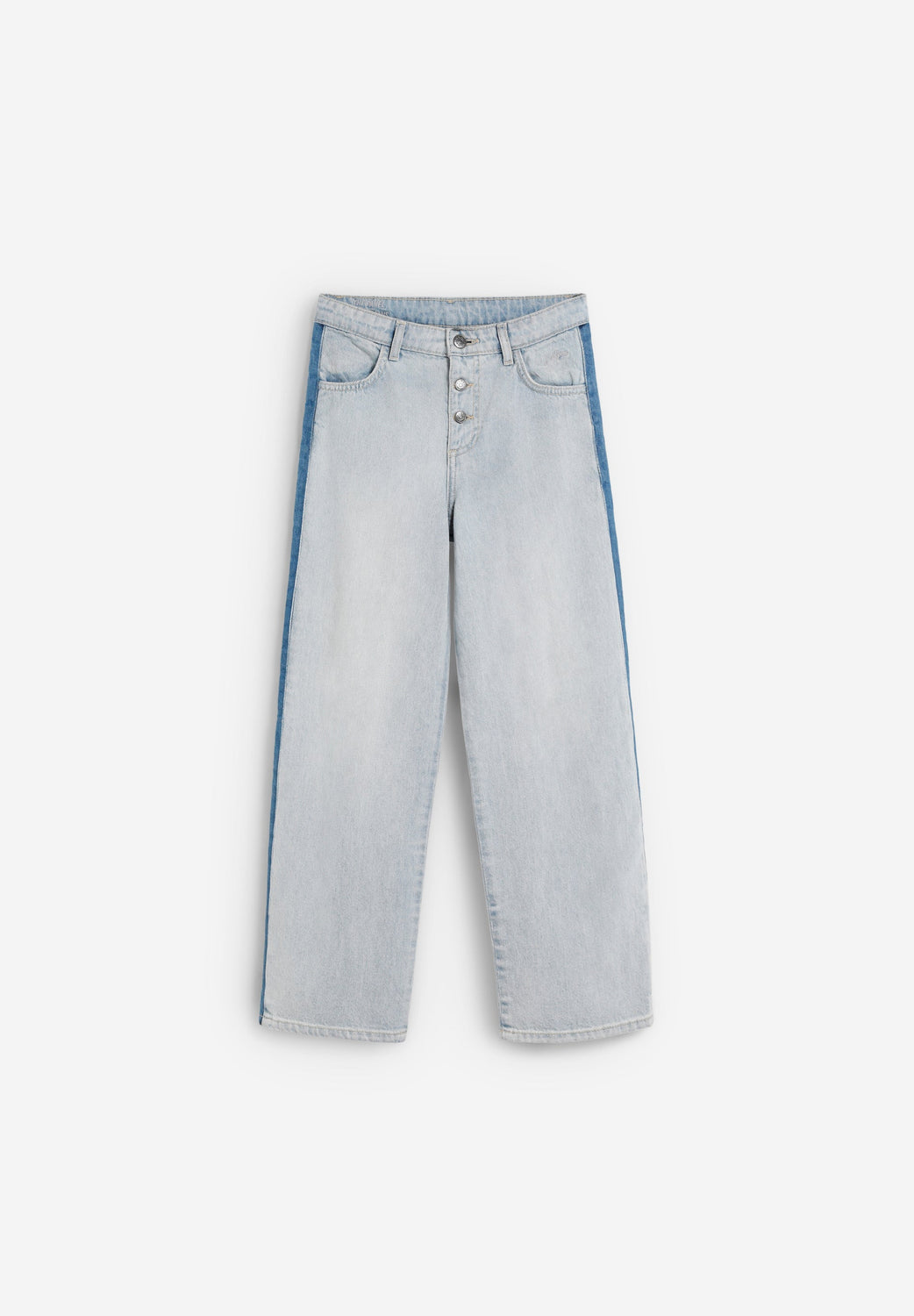 Wide led jeans made of 100% BCI cotton. Two button and zip fastening. Belt loops at the waist. Contrast seam detail on the side. 100% cotton lining.