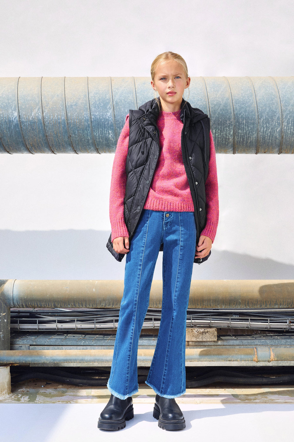Trousers made of slightly stretchy cotton. Flared. Button fastening with skull logo details. Front pockets and back patch pockets Finished with fringing and front stitching.