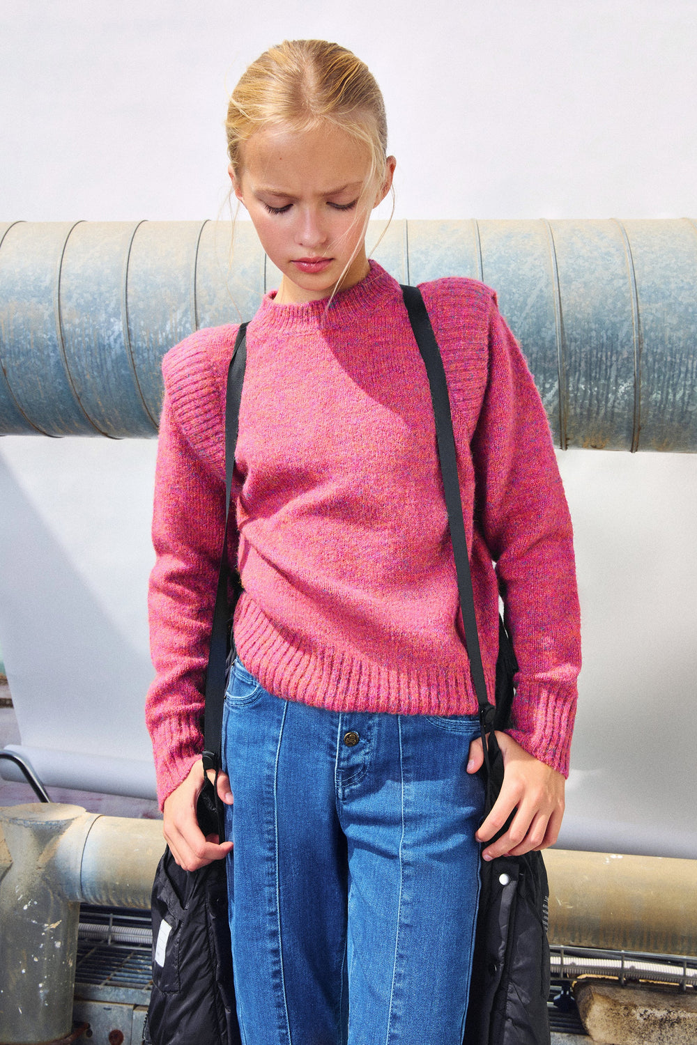 Knit sweater. Long sleeves. Round neck. Ribbed trim. Metallic skull detail.