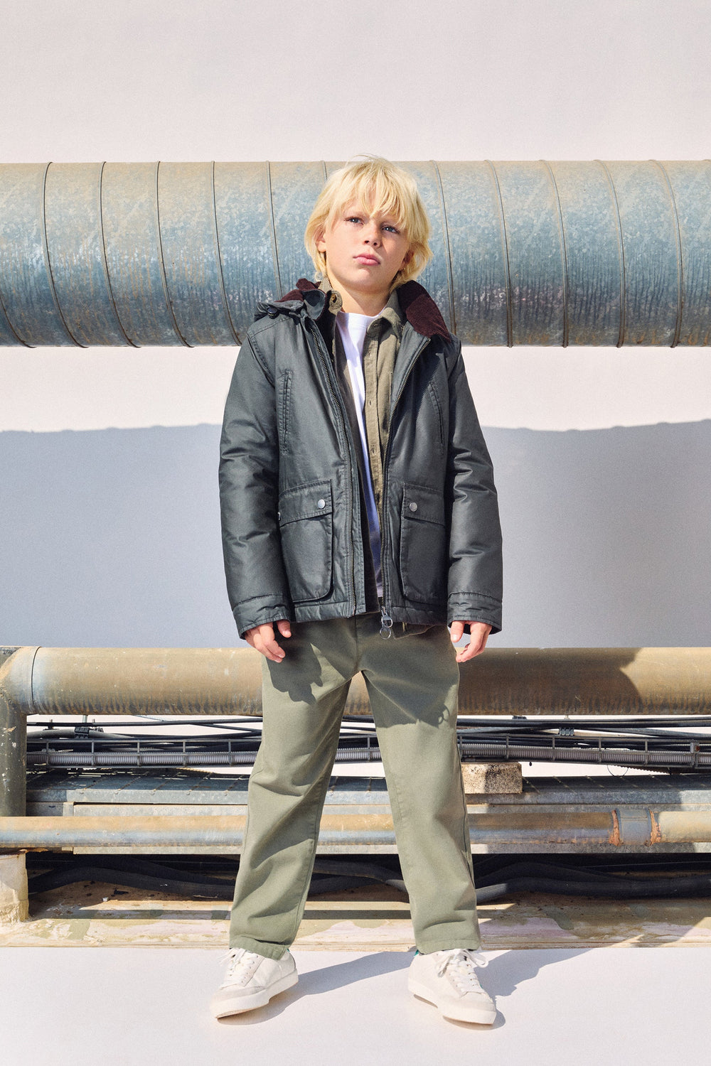 Parka made of 100% BCI cotton with a waxed effect. Regular fit, zip fastening and a detachable adjustable hood. Long sleeves and pockets with snap buttons and zip fastening. Corduroy lining.