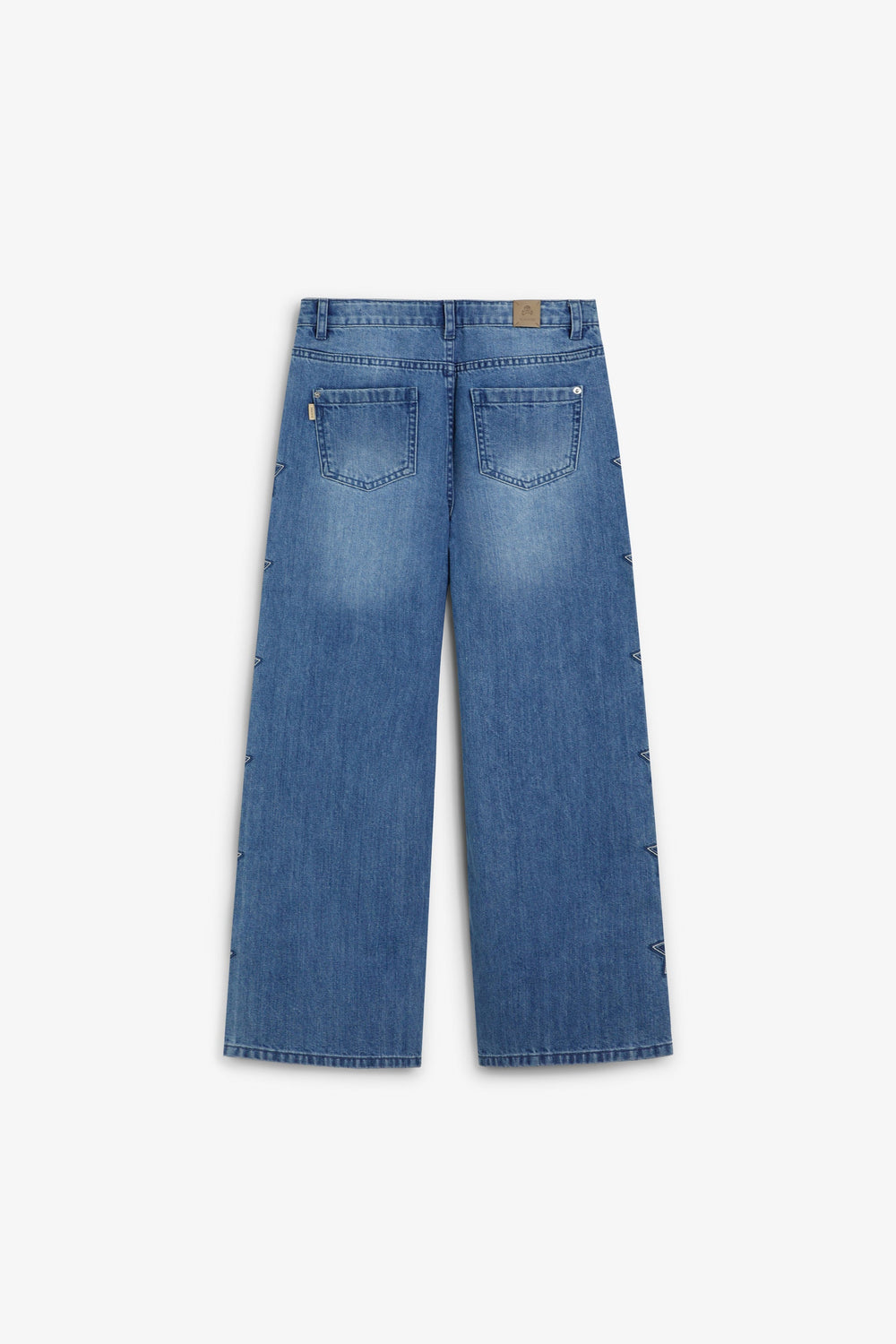 Wide led trousers made of 100% organic cotton. Button and zip fastening. Belt loops at the waist. Two front pockets and back pockets. Embroidered star detailing on the sides.