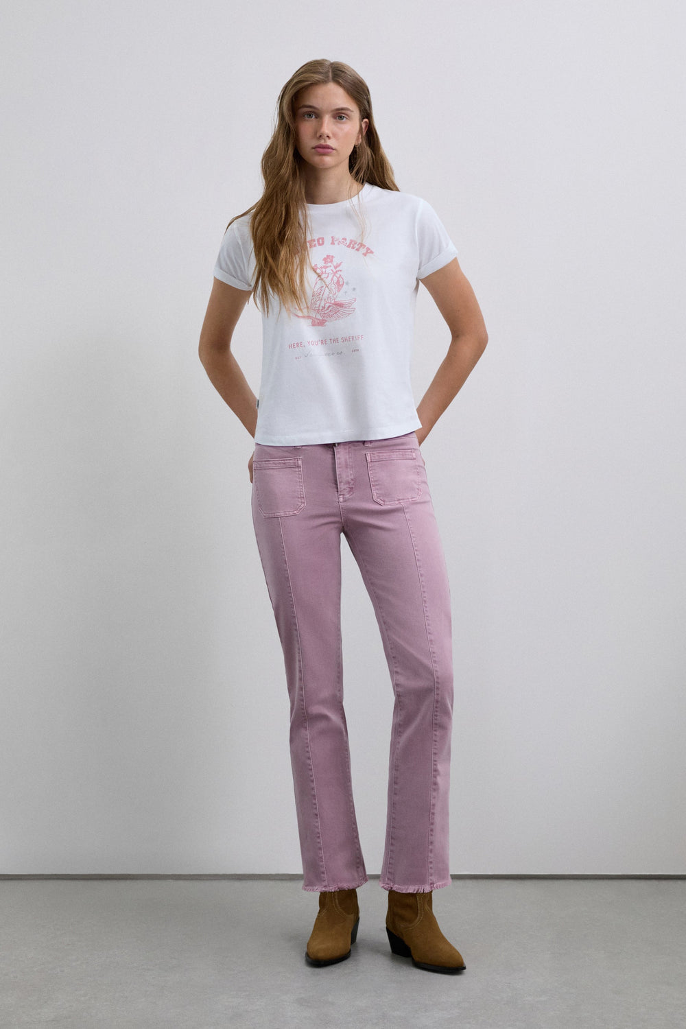 Flared trousers made of BCI cotton. Button and zip fastening. Belt loops at the waist. Front and back pockets. Seam detail on the front. Side slit and frayed hems.