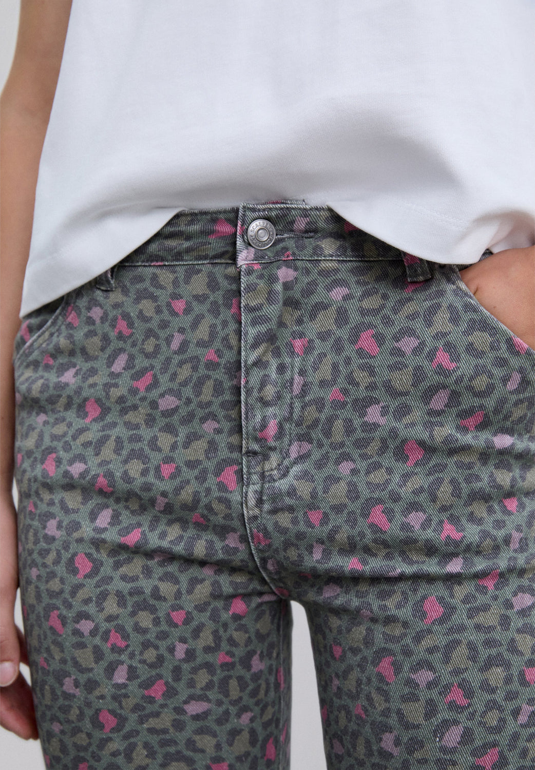 Denim jeans. Two front pockets. Two back pockets with skull and logo label detail. Frayed motif on the hems. Belt loops at the waist. Button and zip fastening. Animal print.