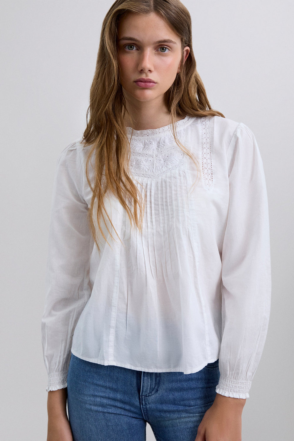 Blouse made of 100% BCI cotton. Regular fit. Round neck. Long puff sleeves with elastic trim. Metallic logo detail on waistband. Embroidered details on collar and front. Back button fastening.