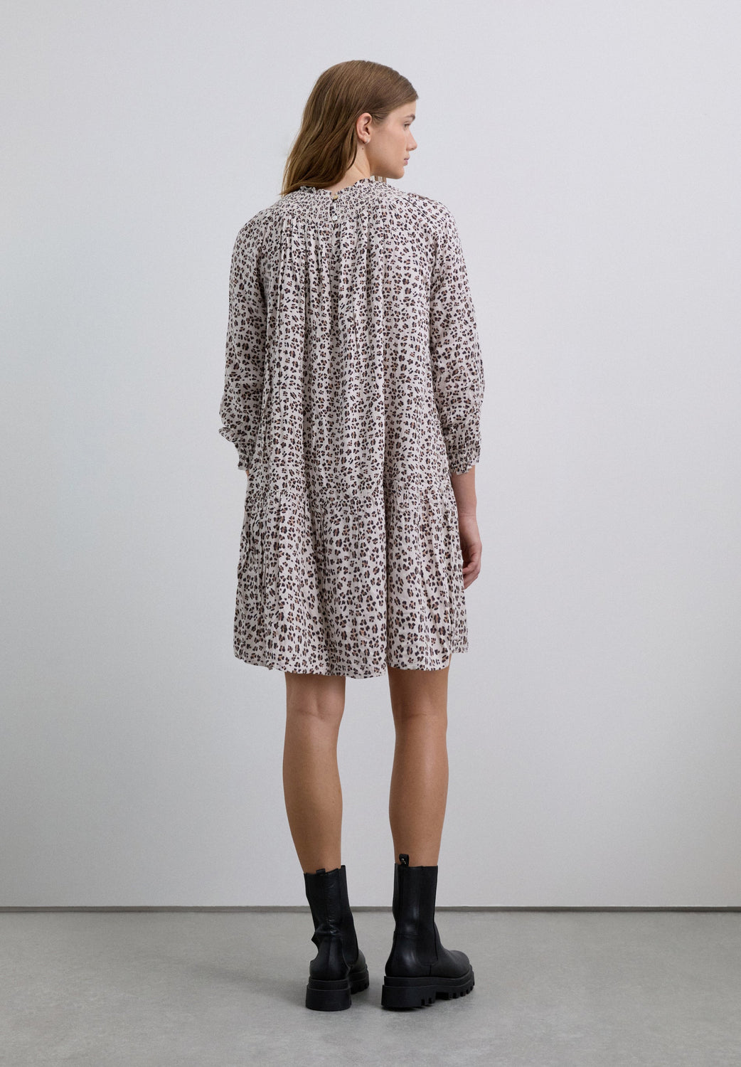 Animal print dress. Slightly puffed long sleeves. Smocking collar and button fastening.