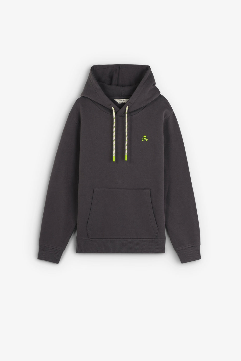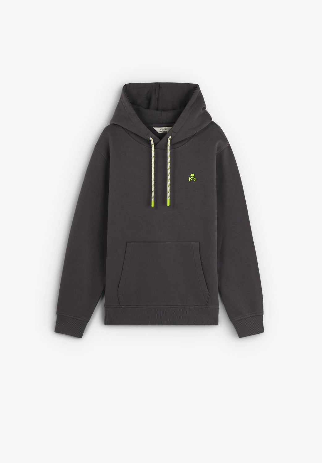 Sudadera confeccionada en 100% algodón BCI. Regular fit. Cuello con capucha ajustable. Manga larga. Bolsillo tipo canguro. Print calavera a contraste. Acabados en rib.