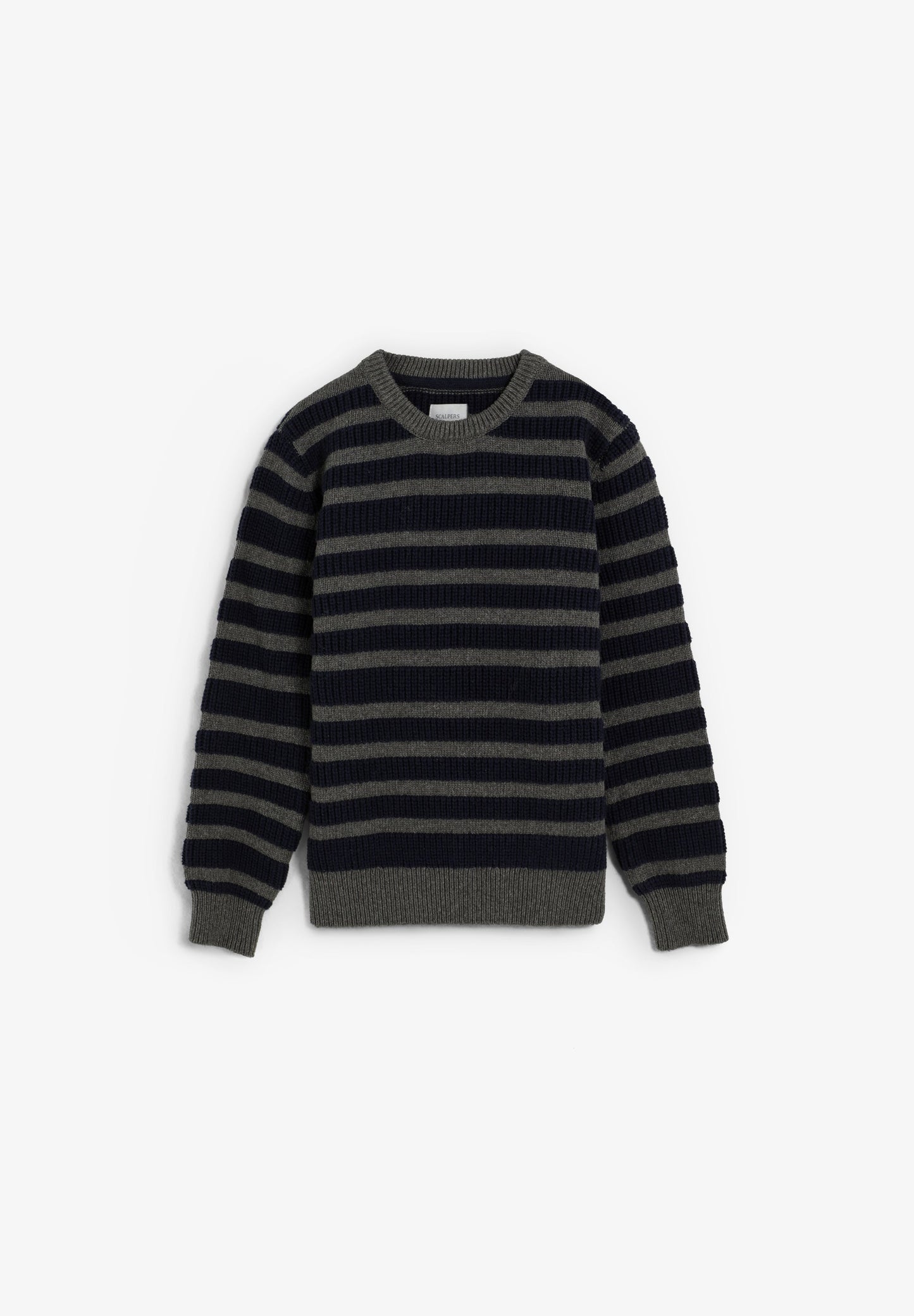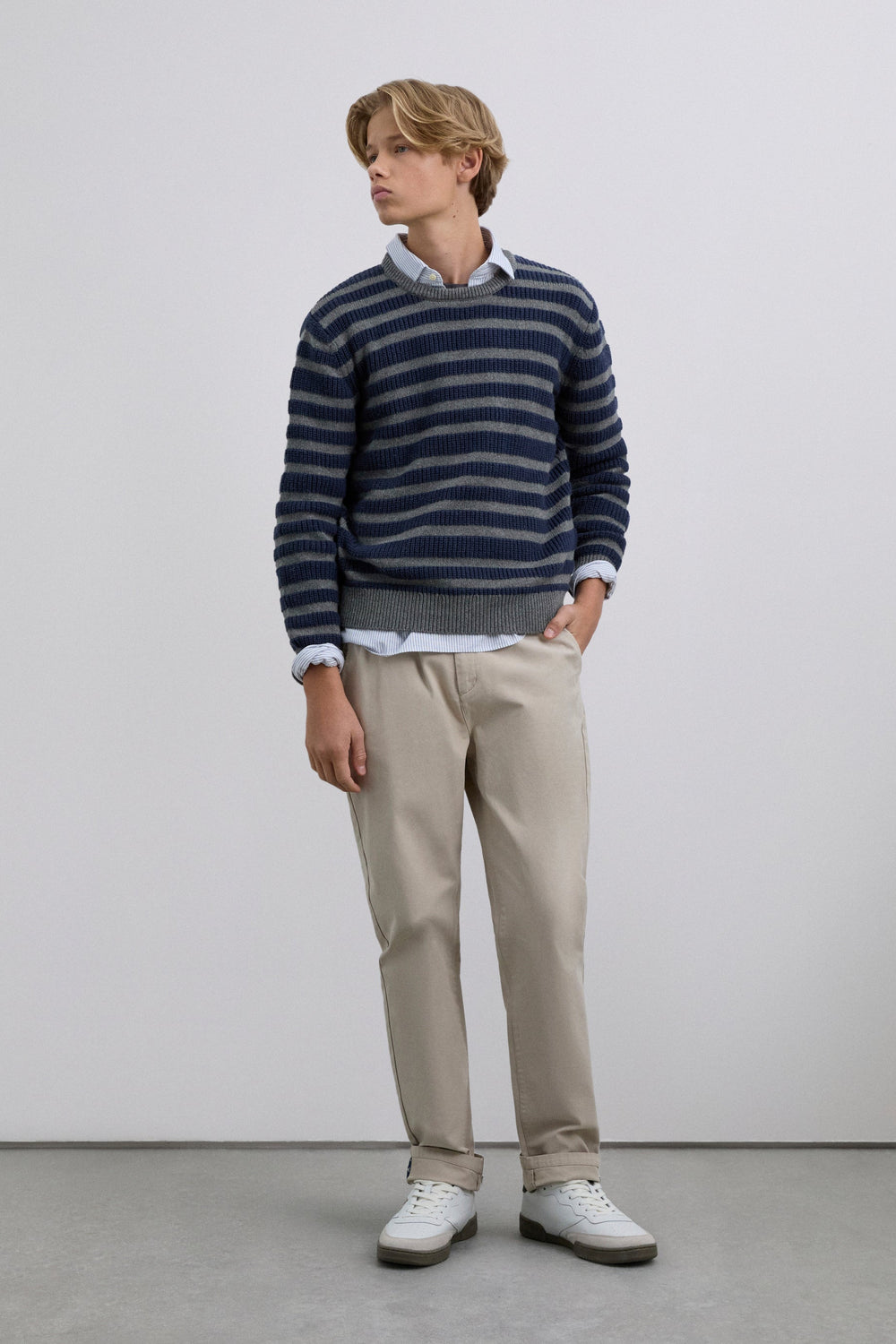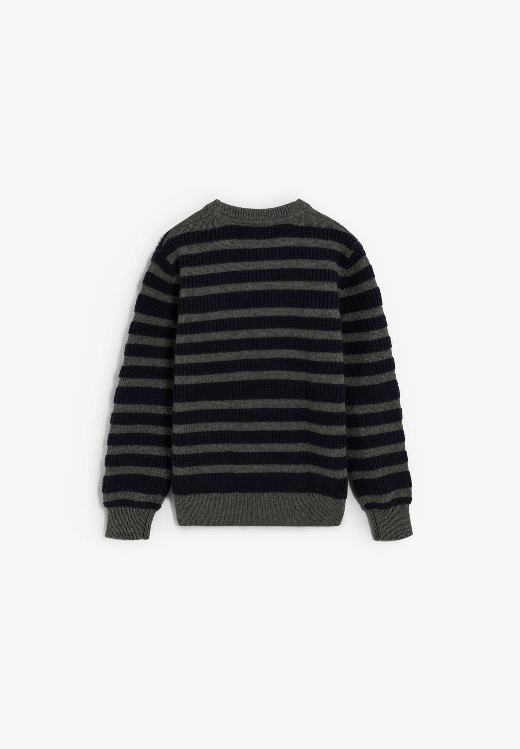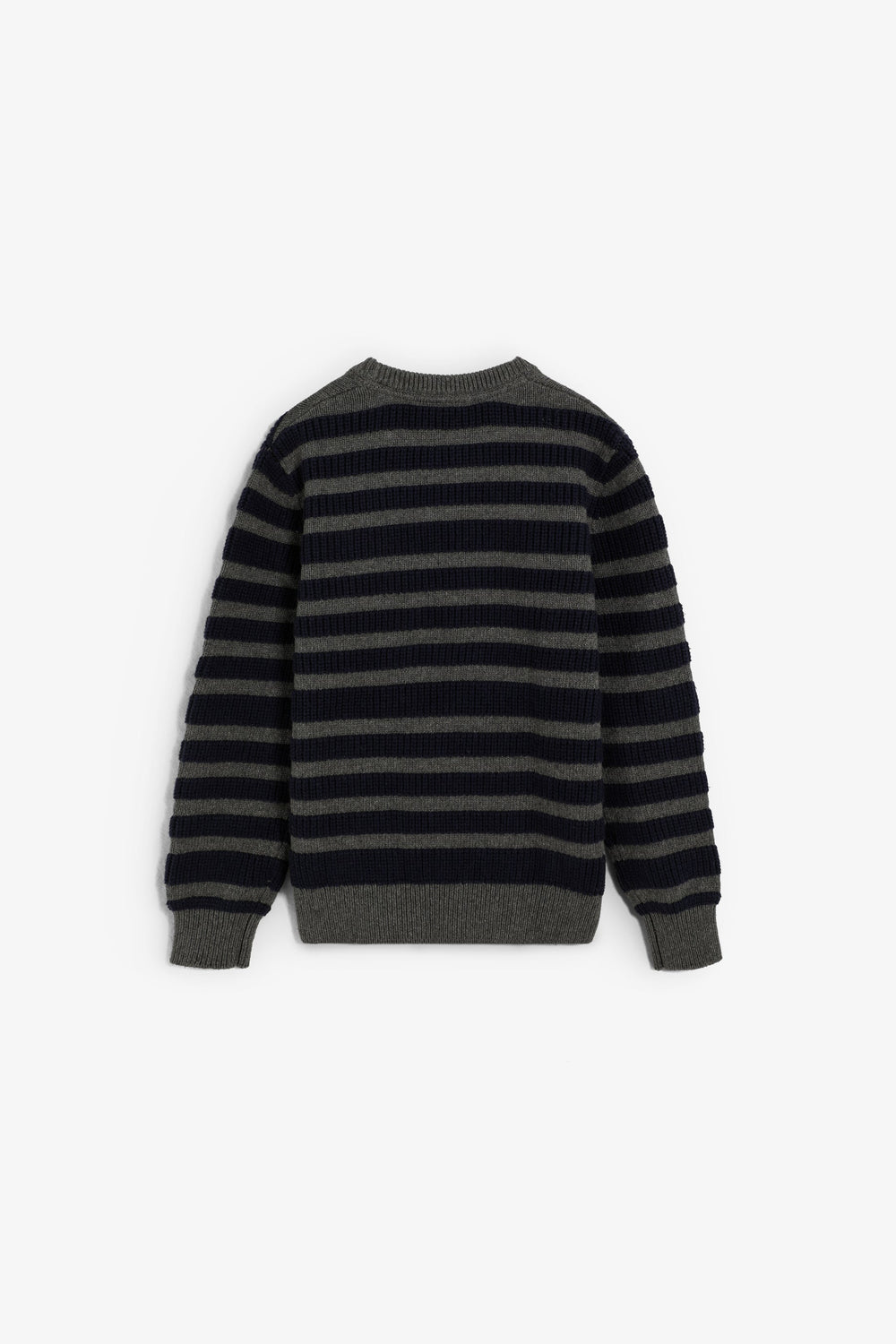 Jersey confeccionado en 100% algodón BCI. Estampado de rayas. Cuello redondo. Manga larga. Acabados en rib.