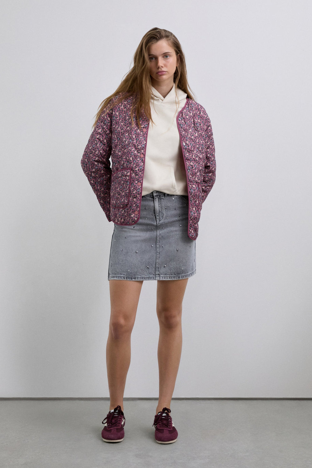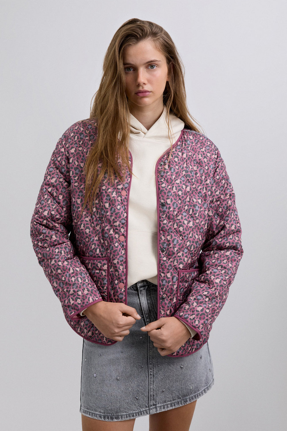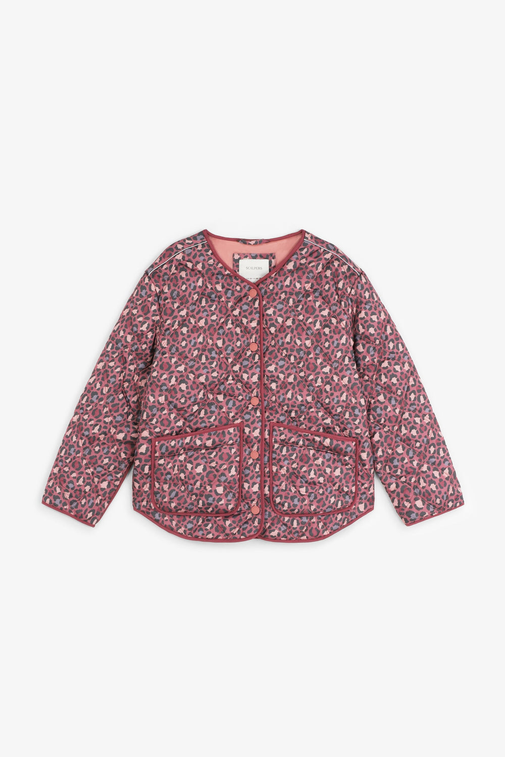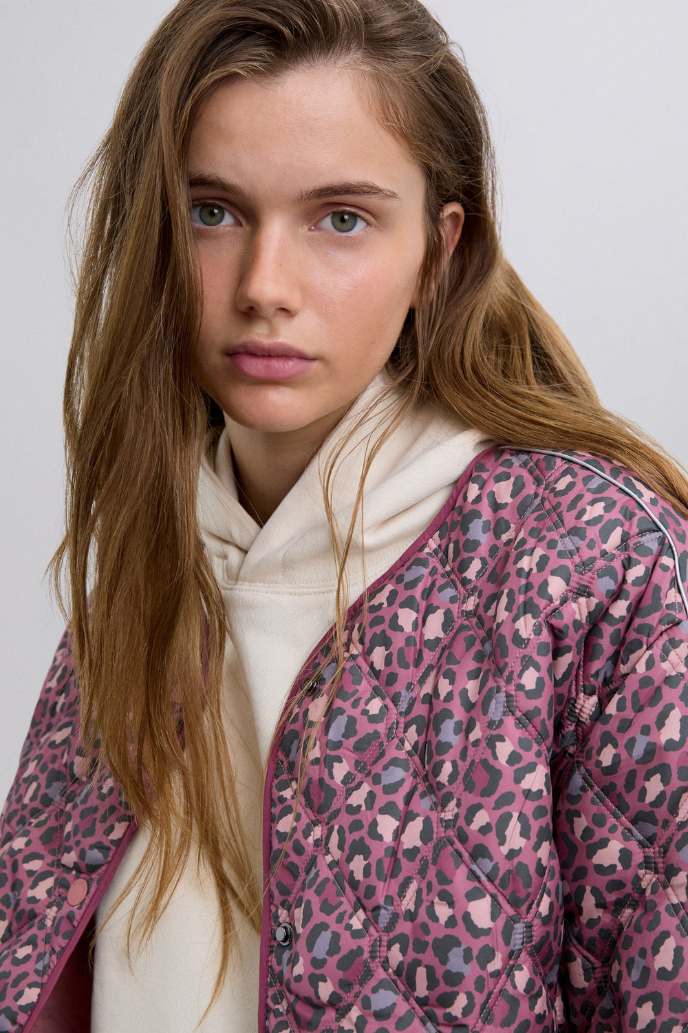 Puffer jacket made of a synthetic blend. Animal print. Button fastening. Slightly V-neck. Long sleeves. Two front pockets.