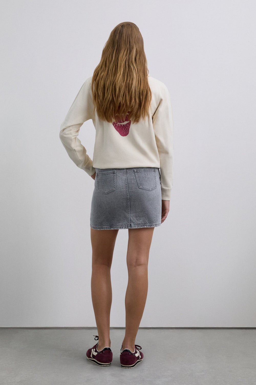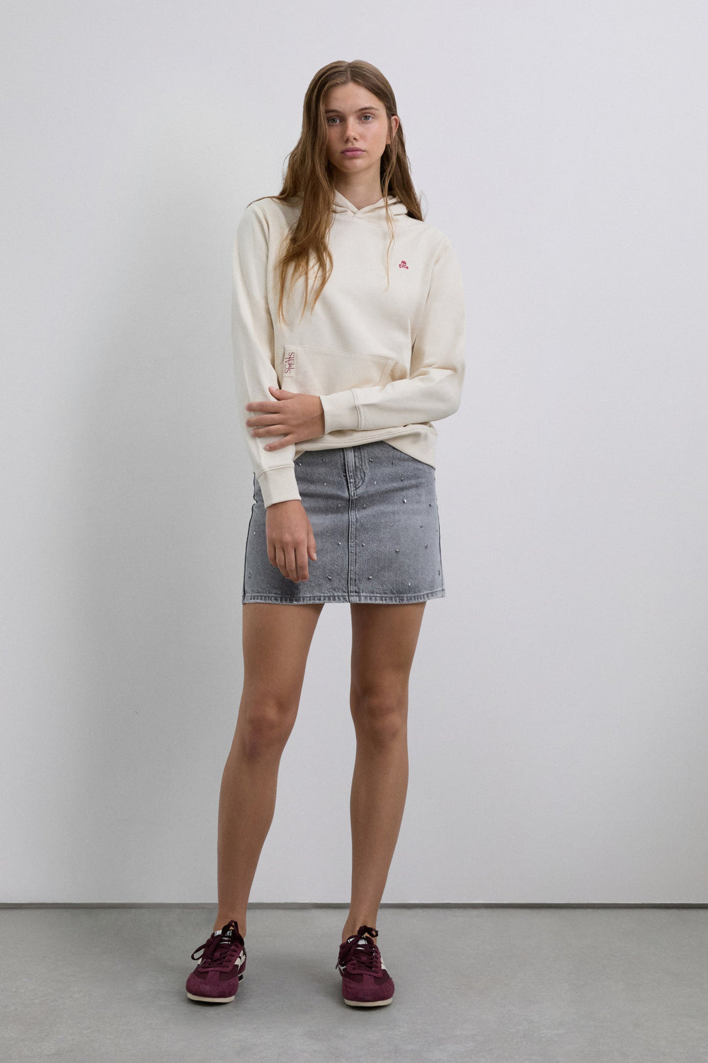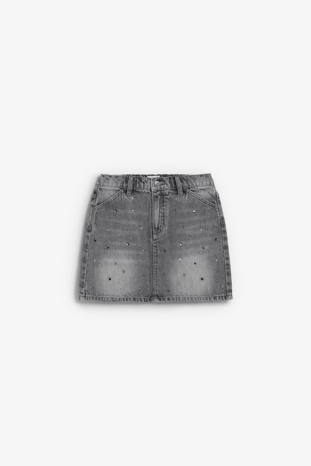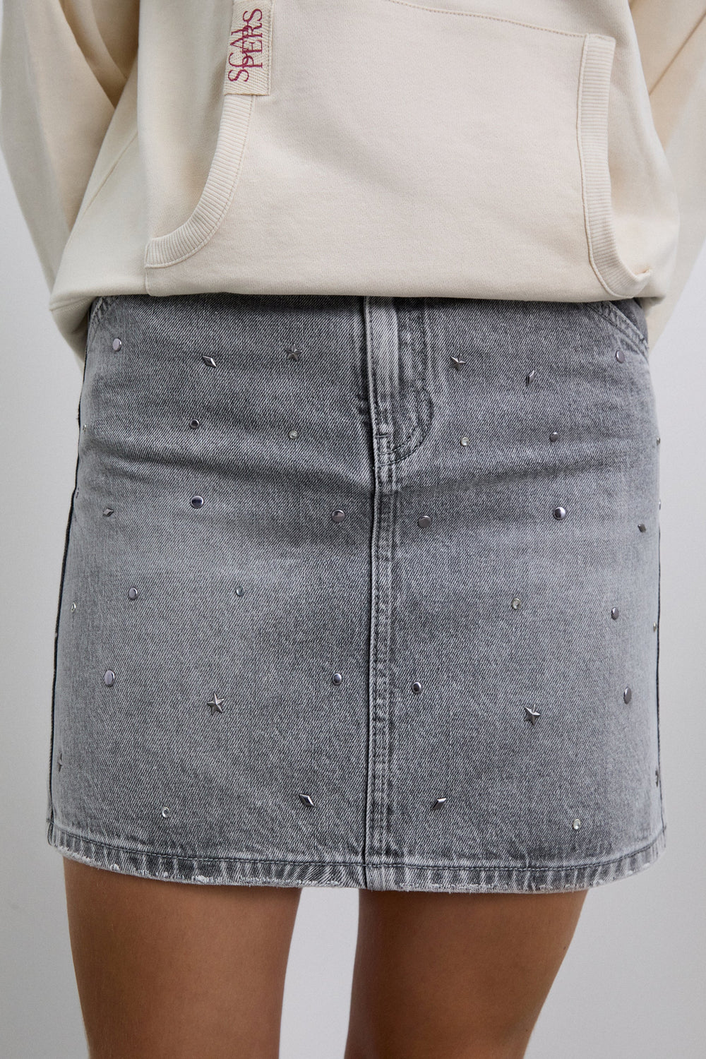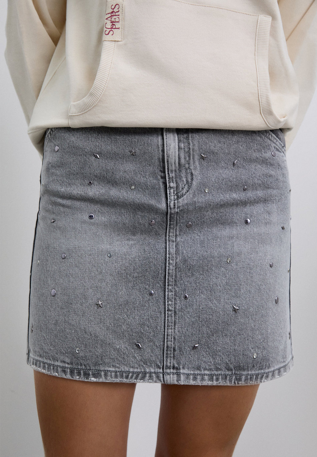 Denim mini skirt made of 100% BCI cotton. Stud detail. Button and zip fastening. Belt loops at the waist. Two front pockets and back pockets.