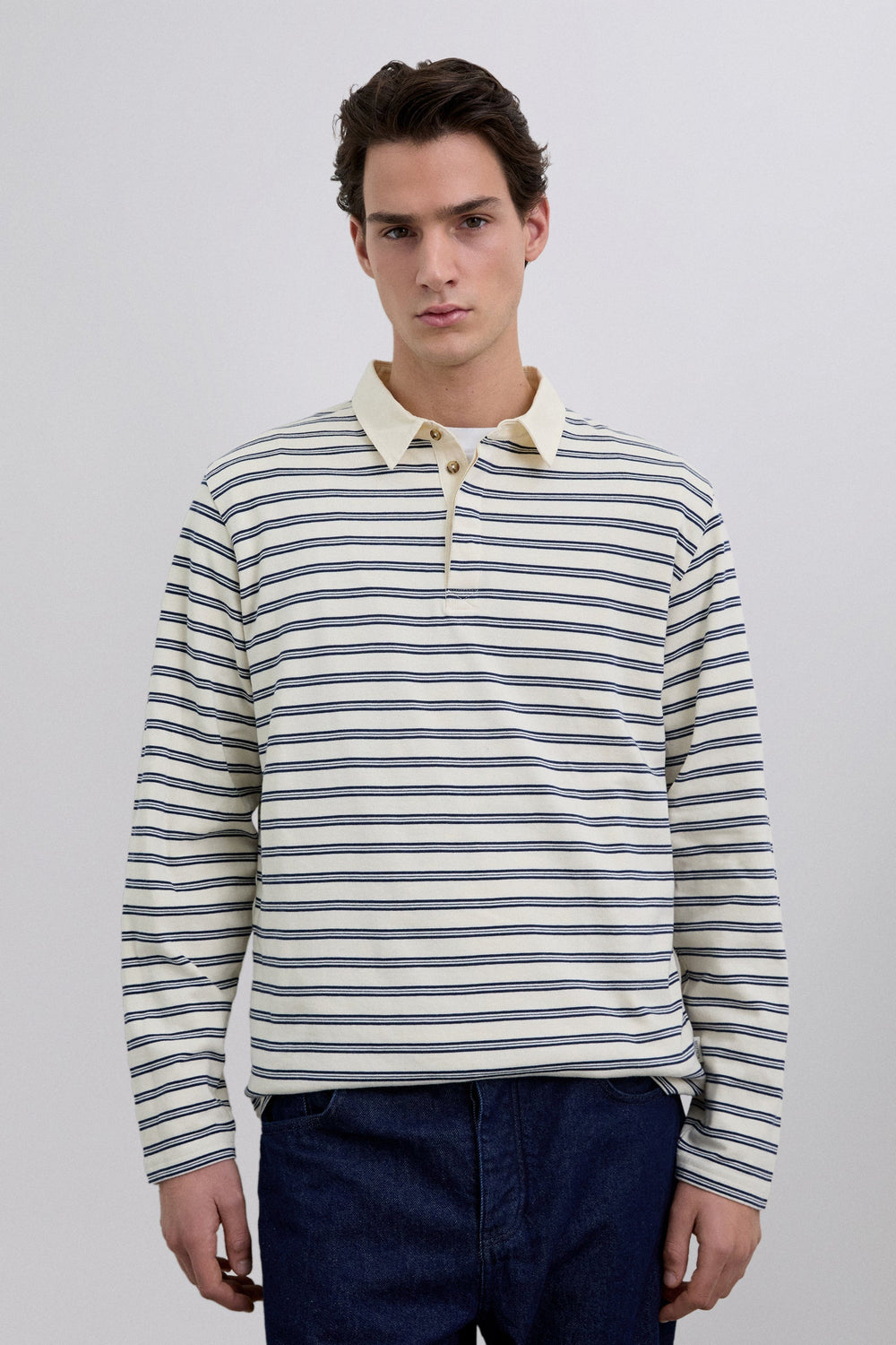 Polo shirt made of knitted 100% BCI cotton. Relaxed fit. Long sleeves. Contrast twill collar. Four-button fastening with concealed placket.