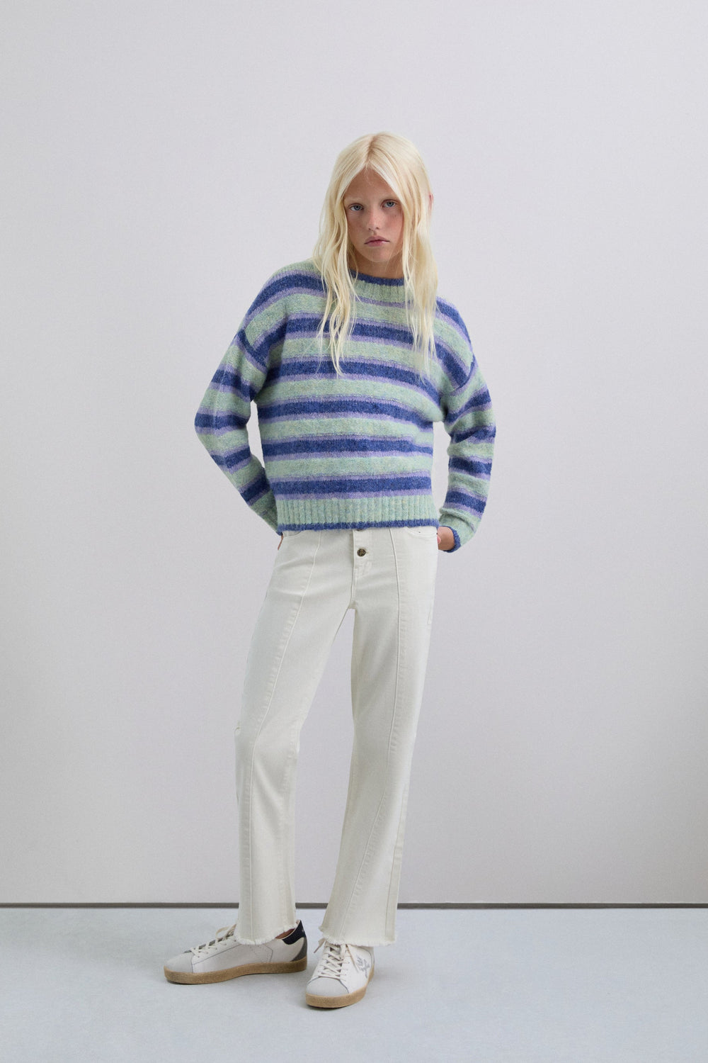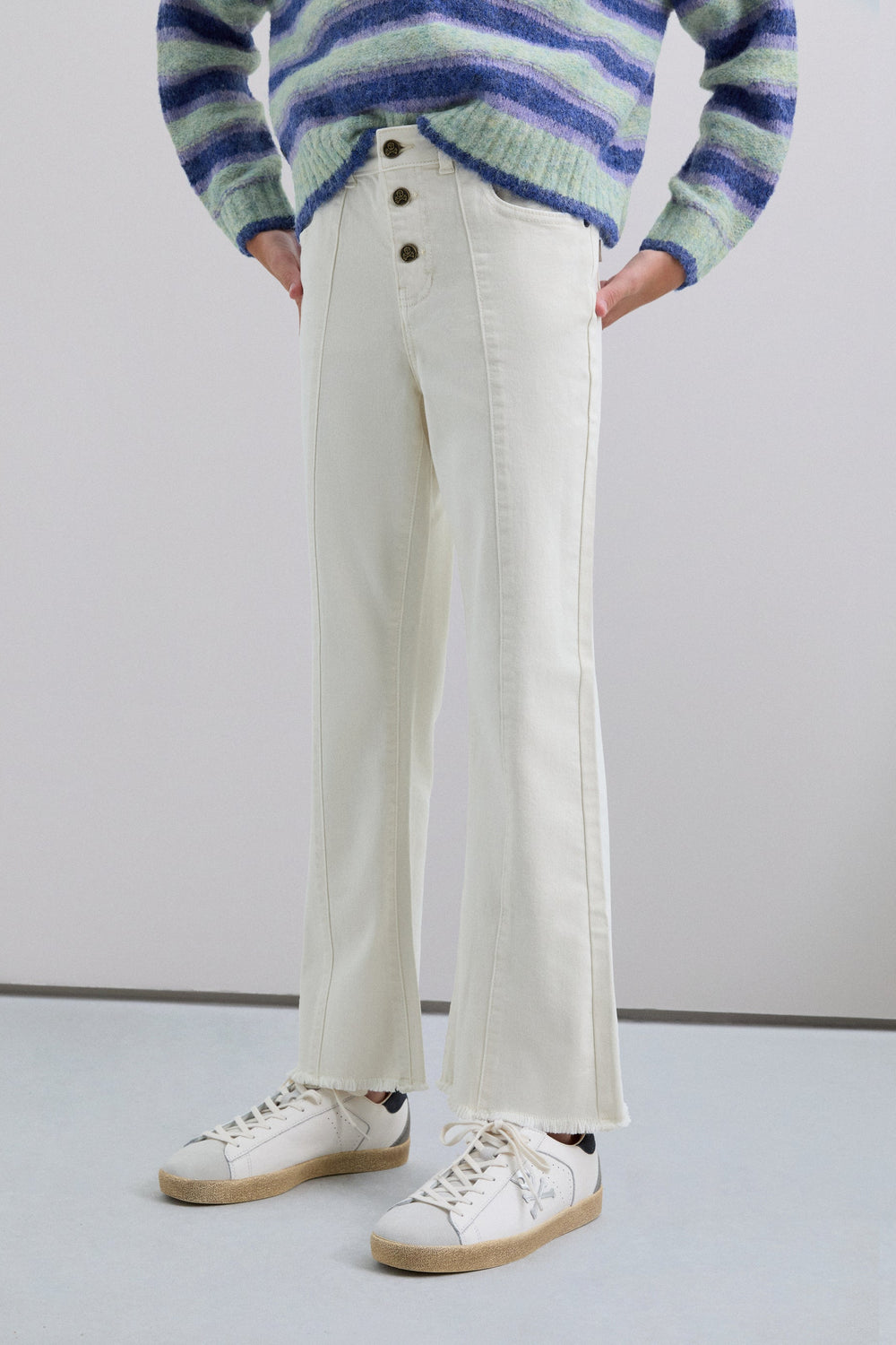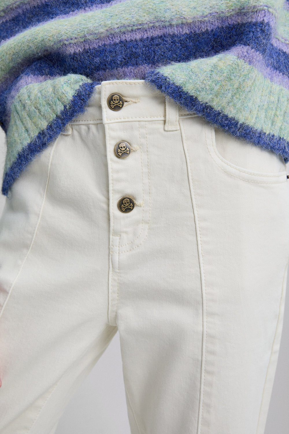 Trousers made of slightly stretchy cotton. Flared. Button fastening with skull logo details. Front pockets and back patch pockets Finished with fringing and front stitching.