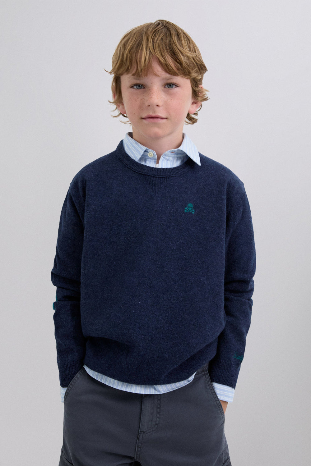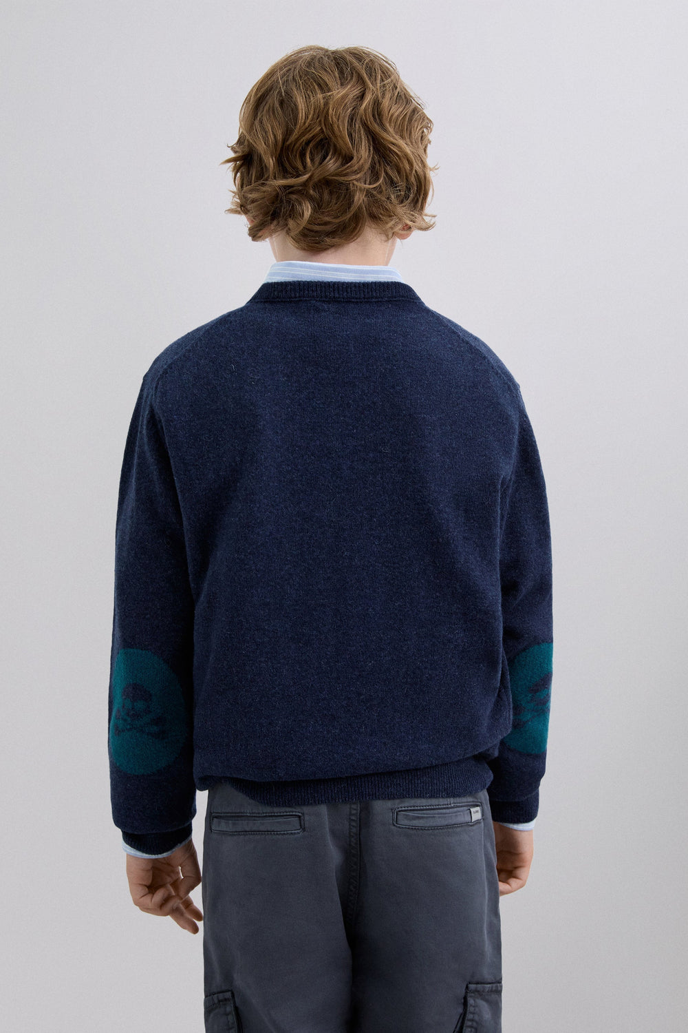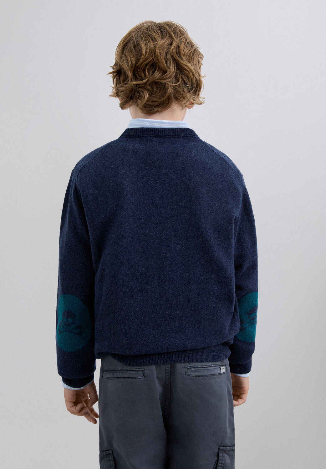 Sweater made of wool and polyamide blend. Regular fit. Round neck. Long sleeves. Contrast embroidered skull detail. Ribbed trim. Contrast skull detail on the elbow pads.