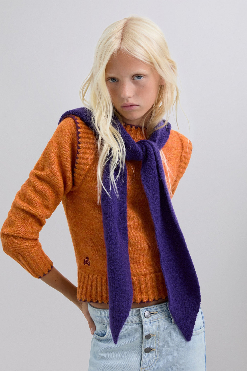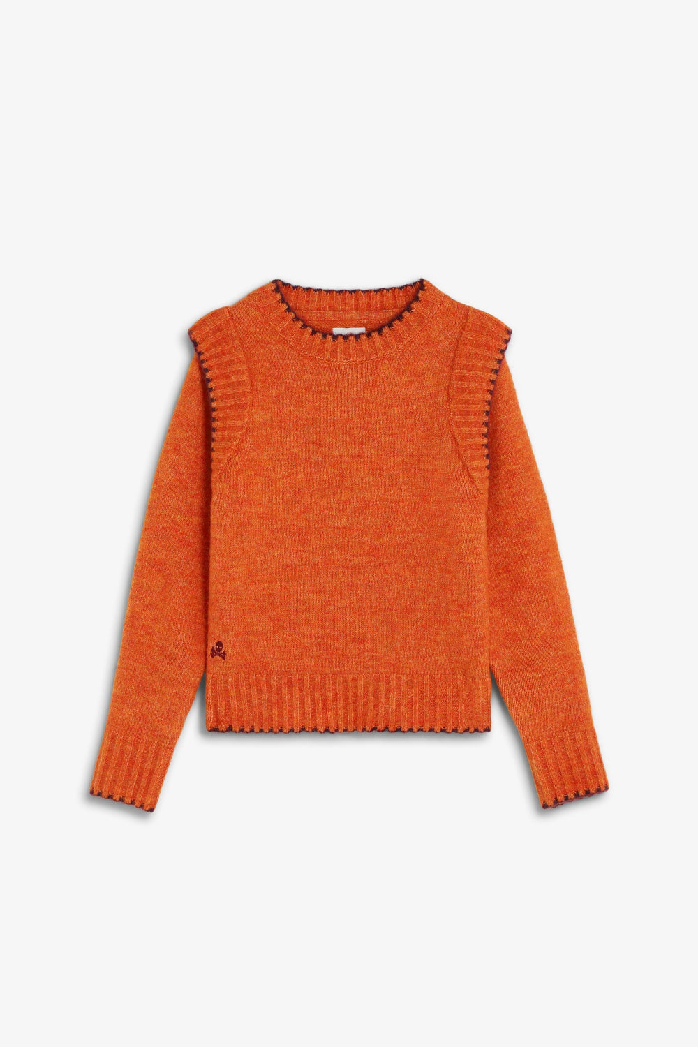 Knit sweater. Round neck. Long sleeves. Contrast embroidered skull detail. Ribbed trim.