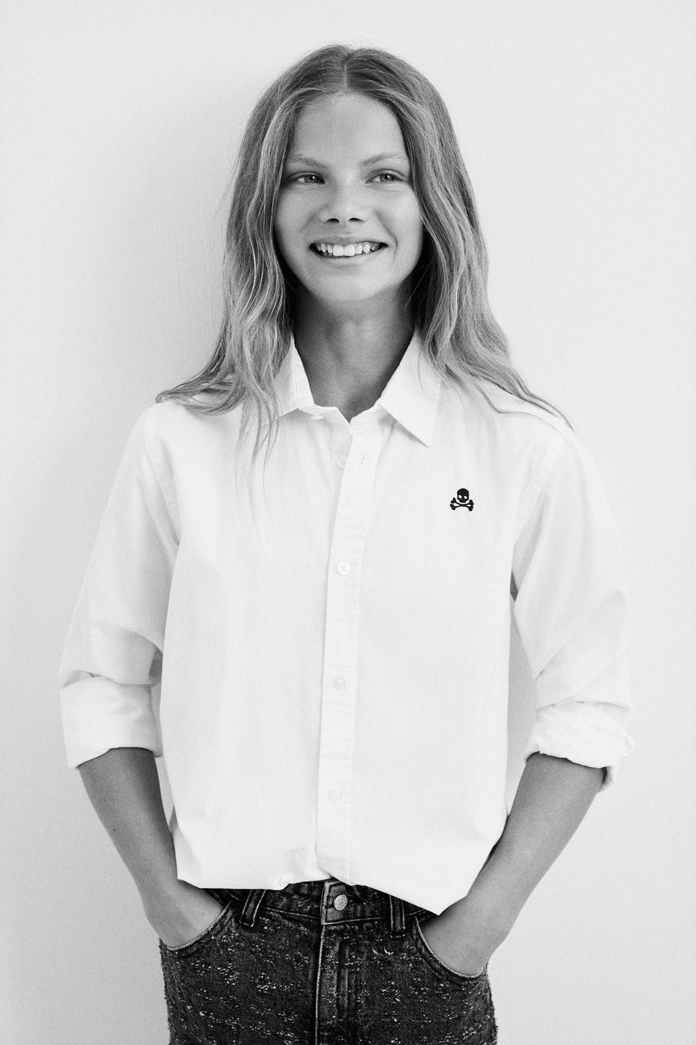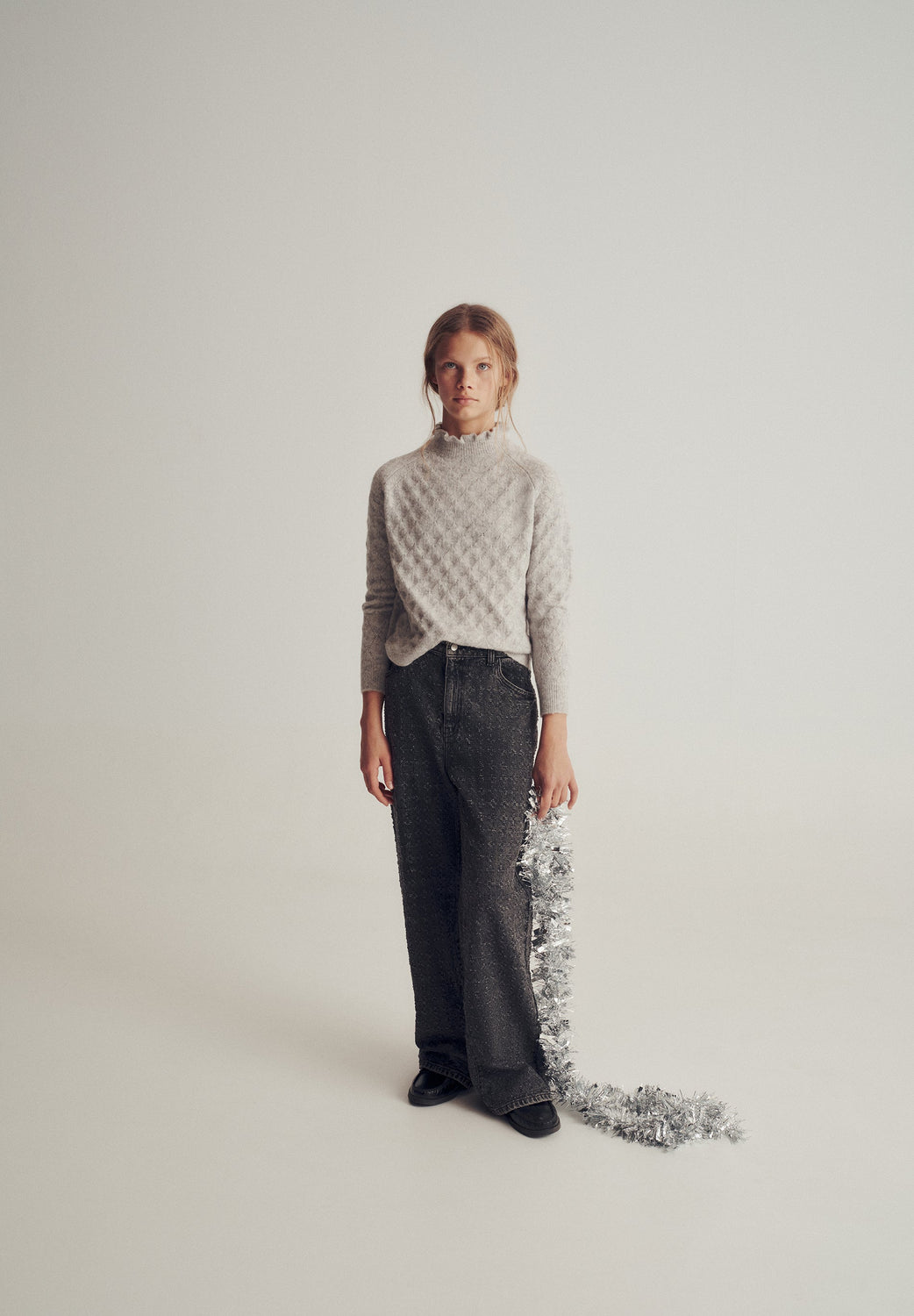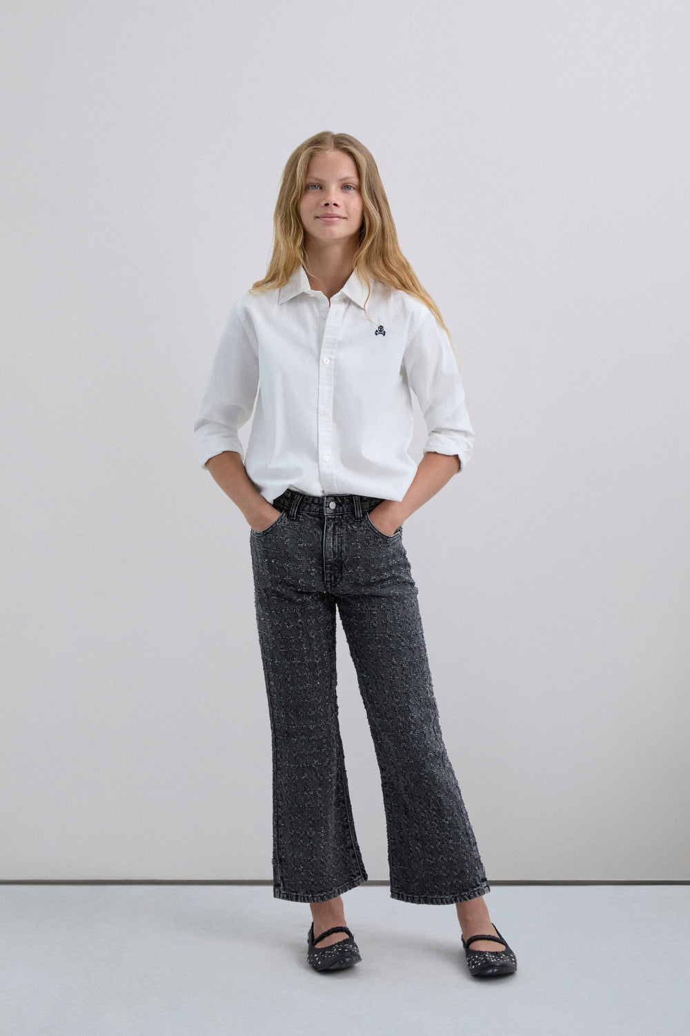 Jeans made of slightly stretchy cotton with laser-printed metallic thread. Flared cut, zip and button fastening and belt loops. Side and back pockets.