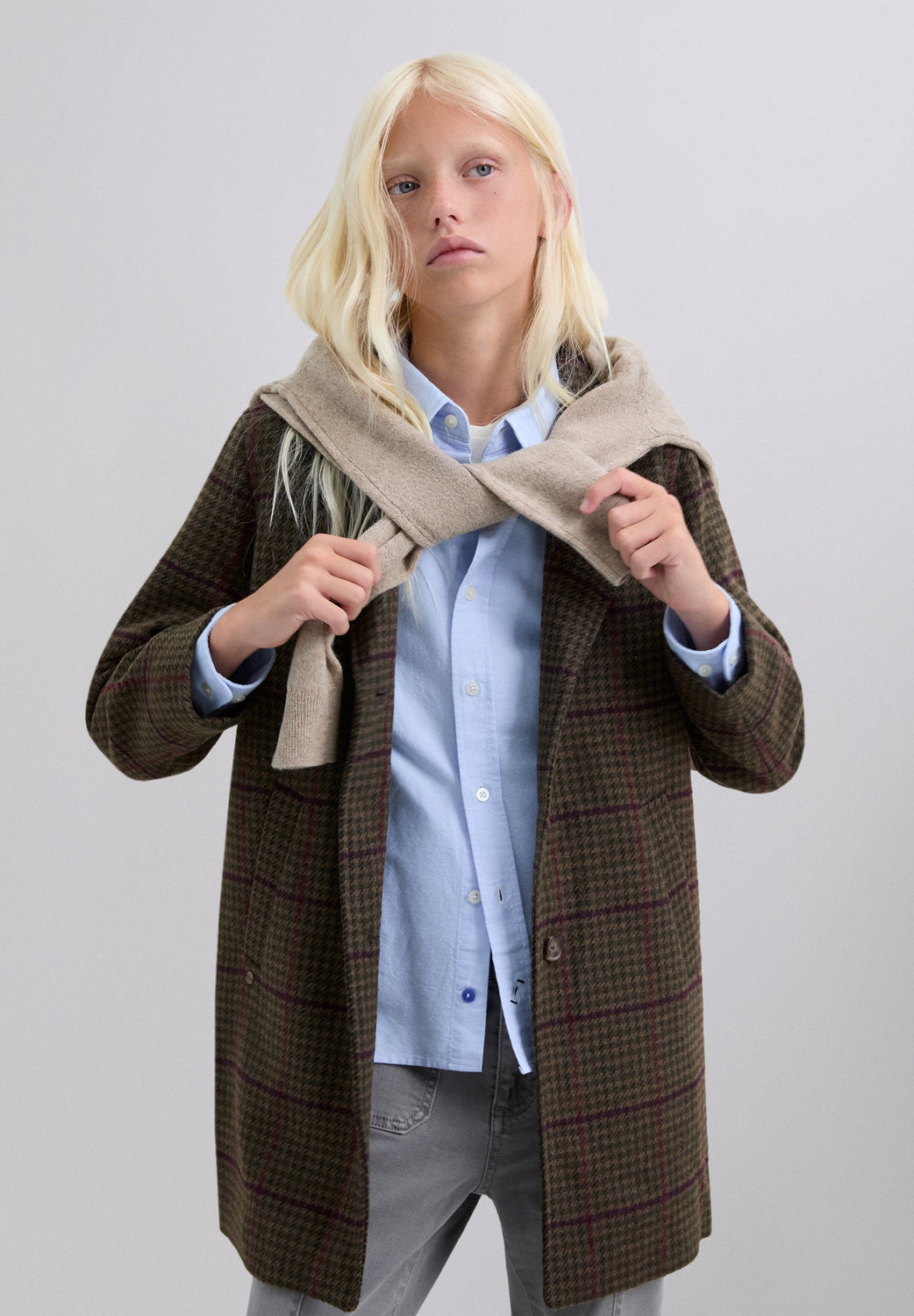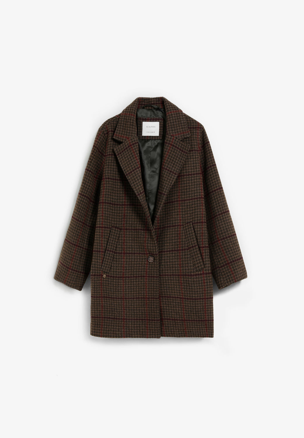 Checked cloth coat. Lapel collar. Button fastening. Long sleeves. Jetted flap pockets.