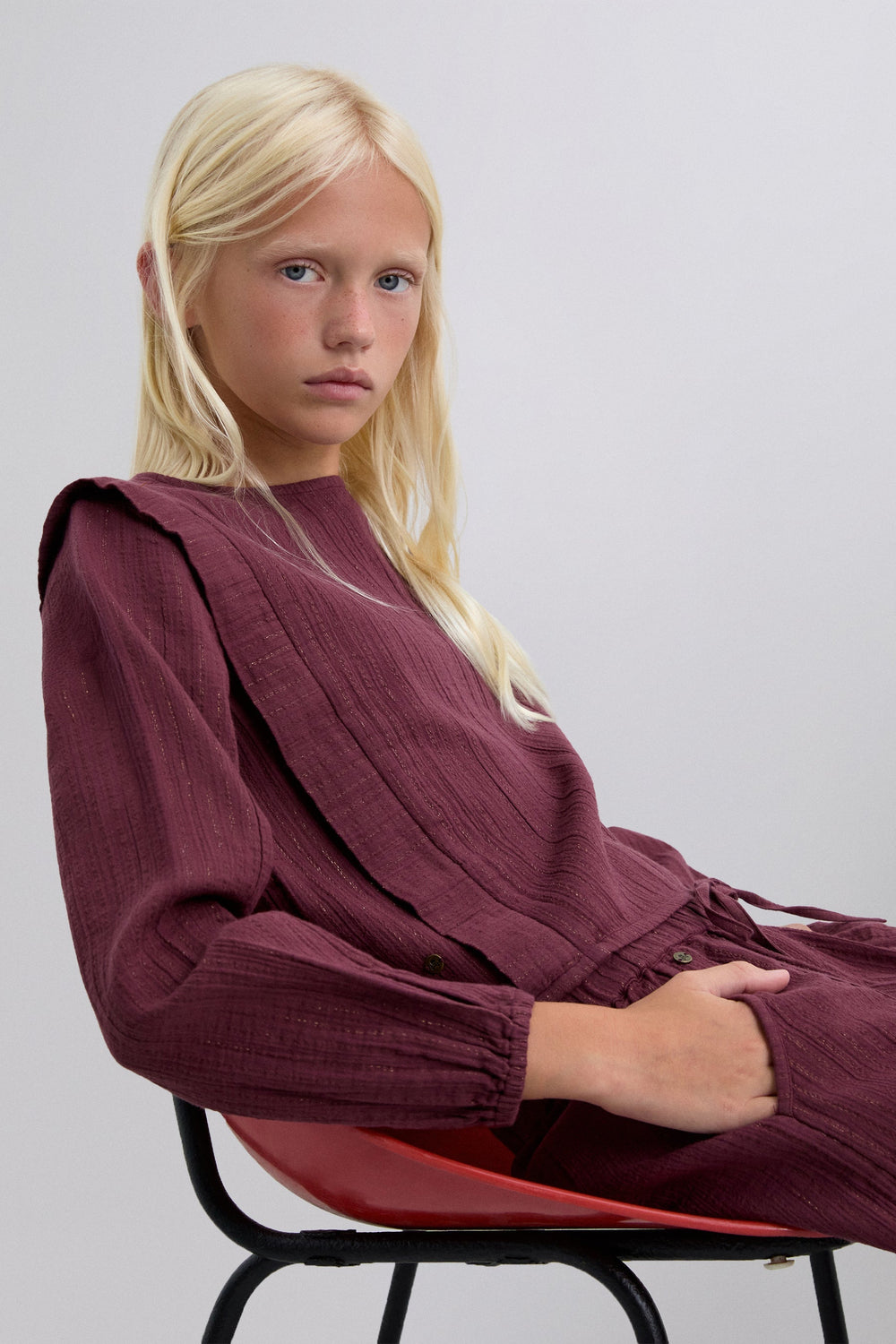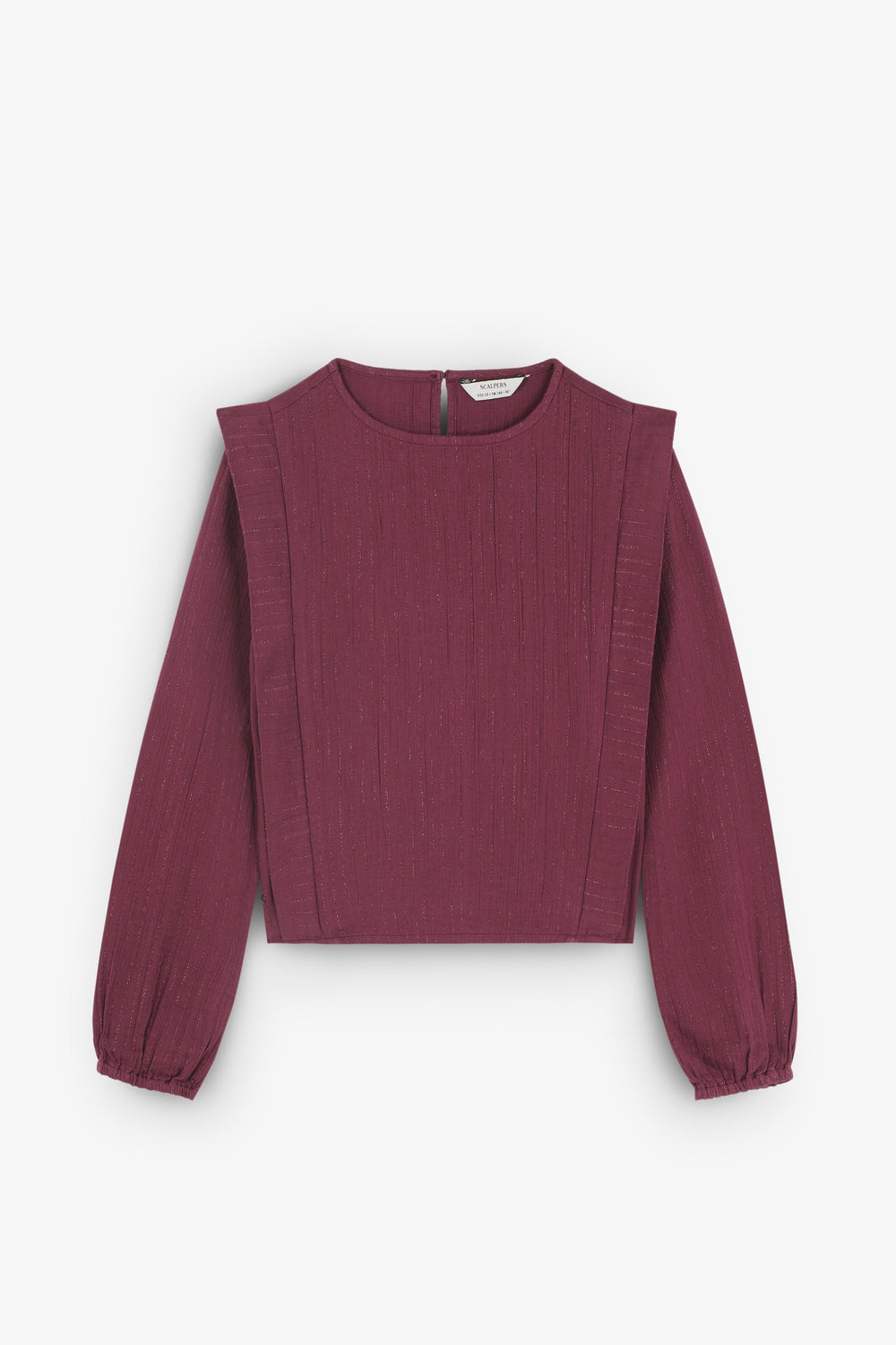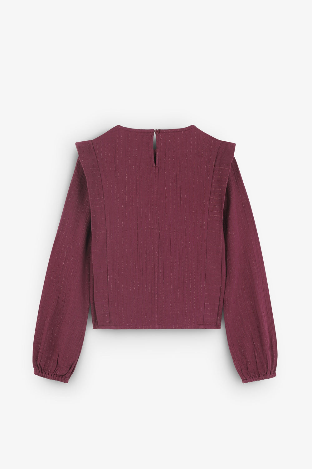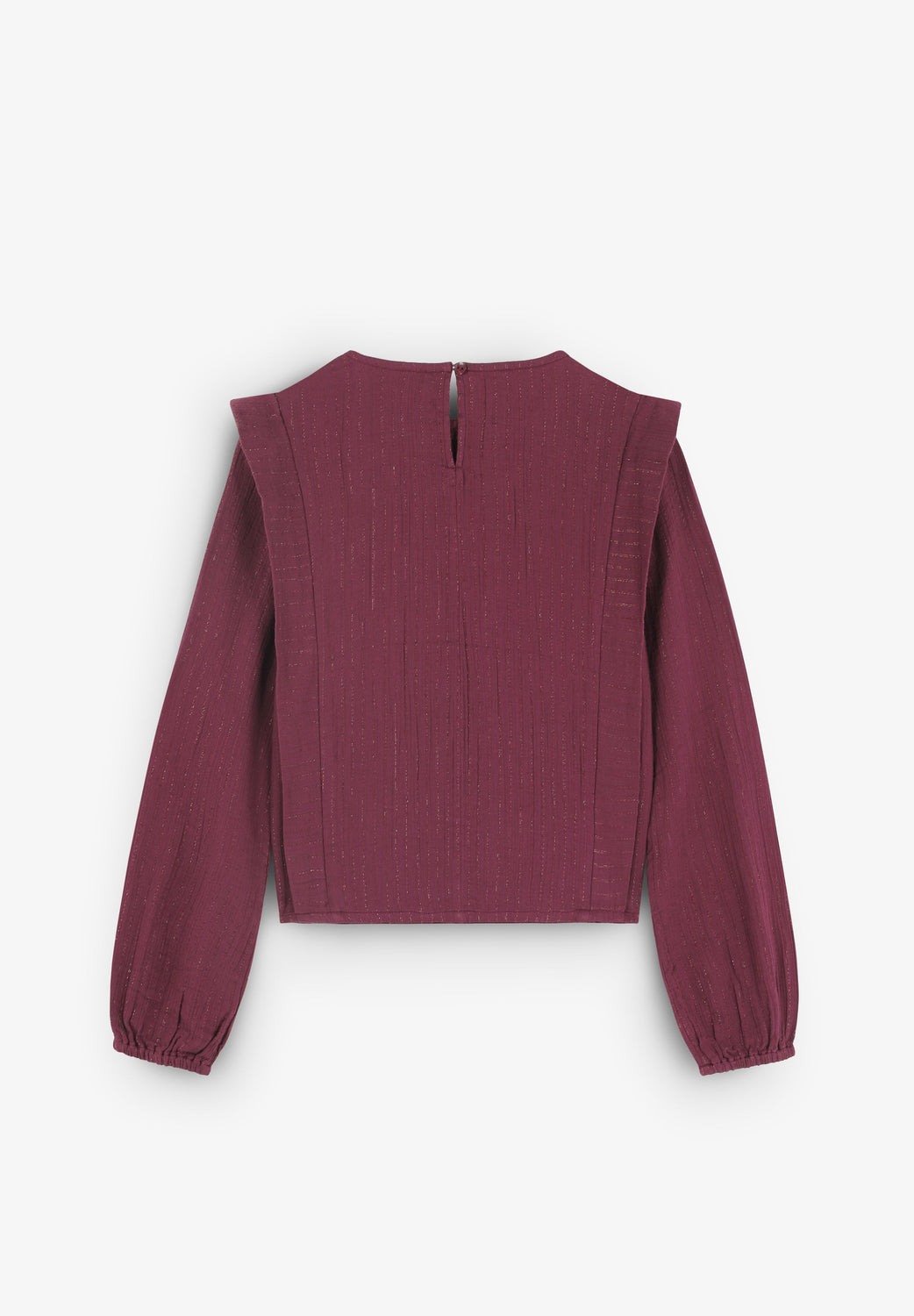 Blouse made of BCI cotton. Round neck. Front pleats. Ribbed details. Long sleeves. Elasticated cuffs. Back button fastening.