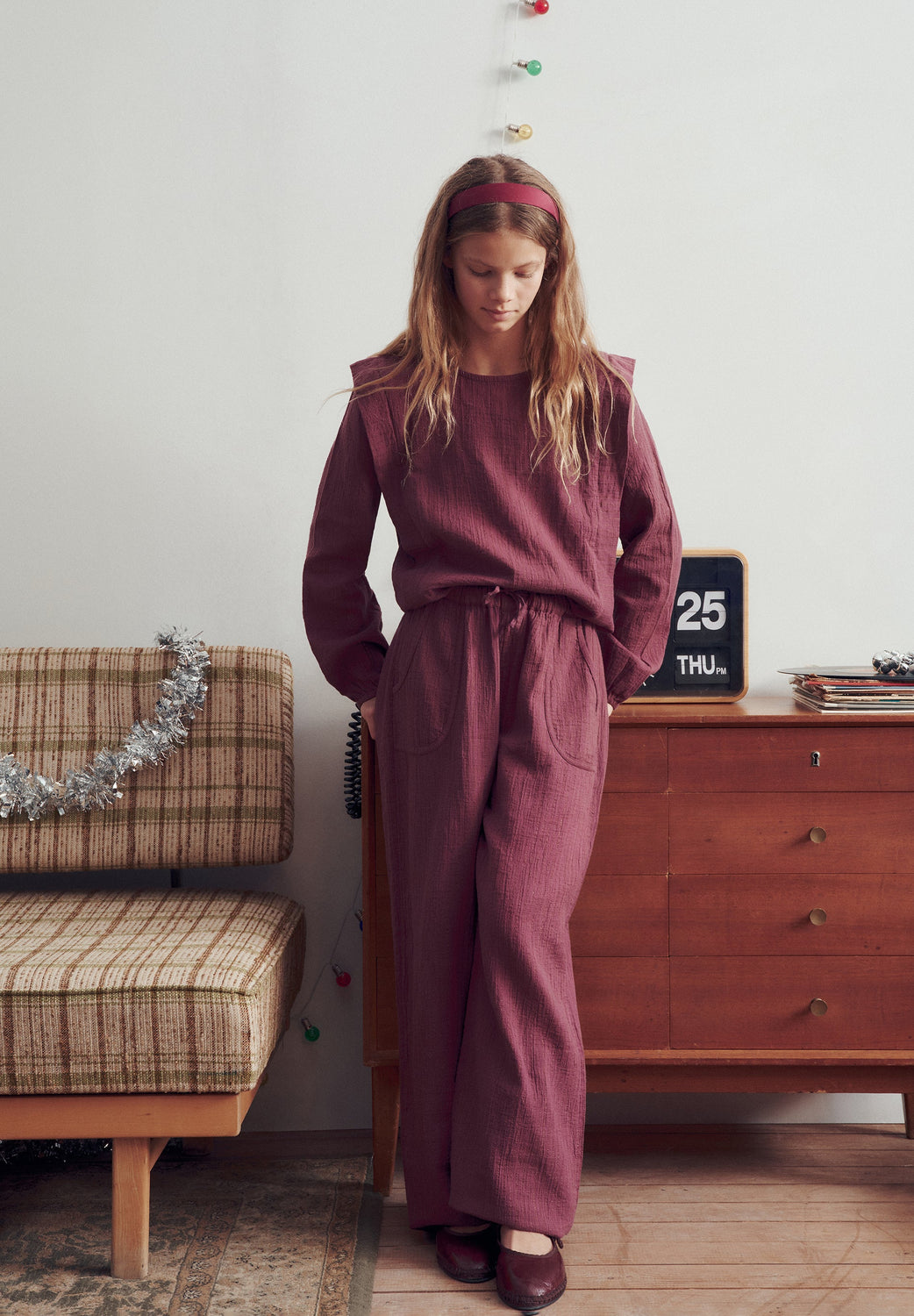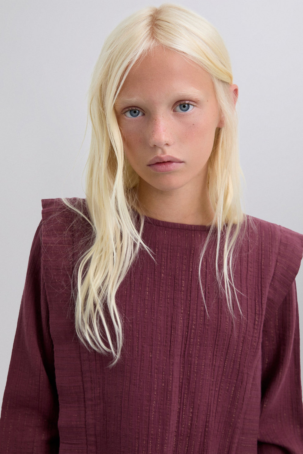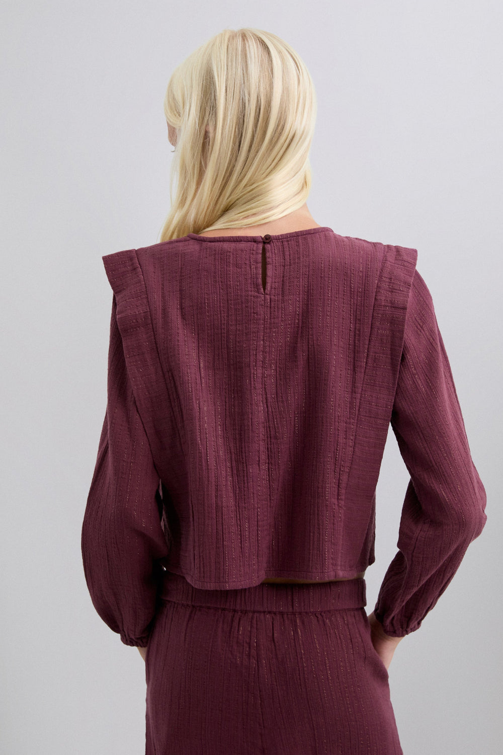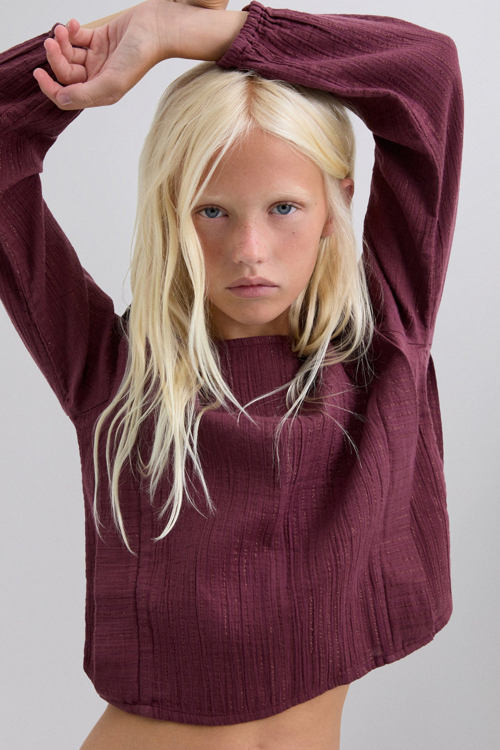 Blouse made of BCI cotton. Round neck. Front pleats. Ribbed details. Long sleeves. Elasticated cuffs. Back button fastening.
