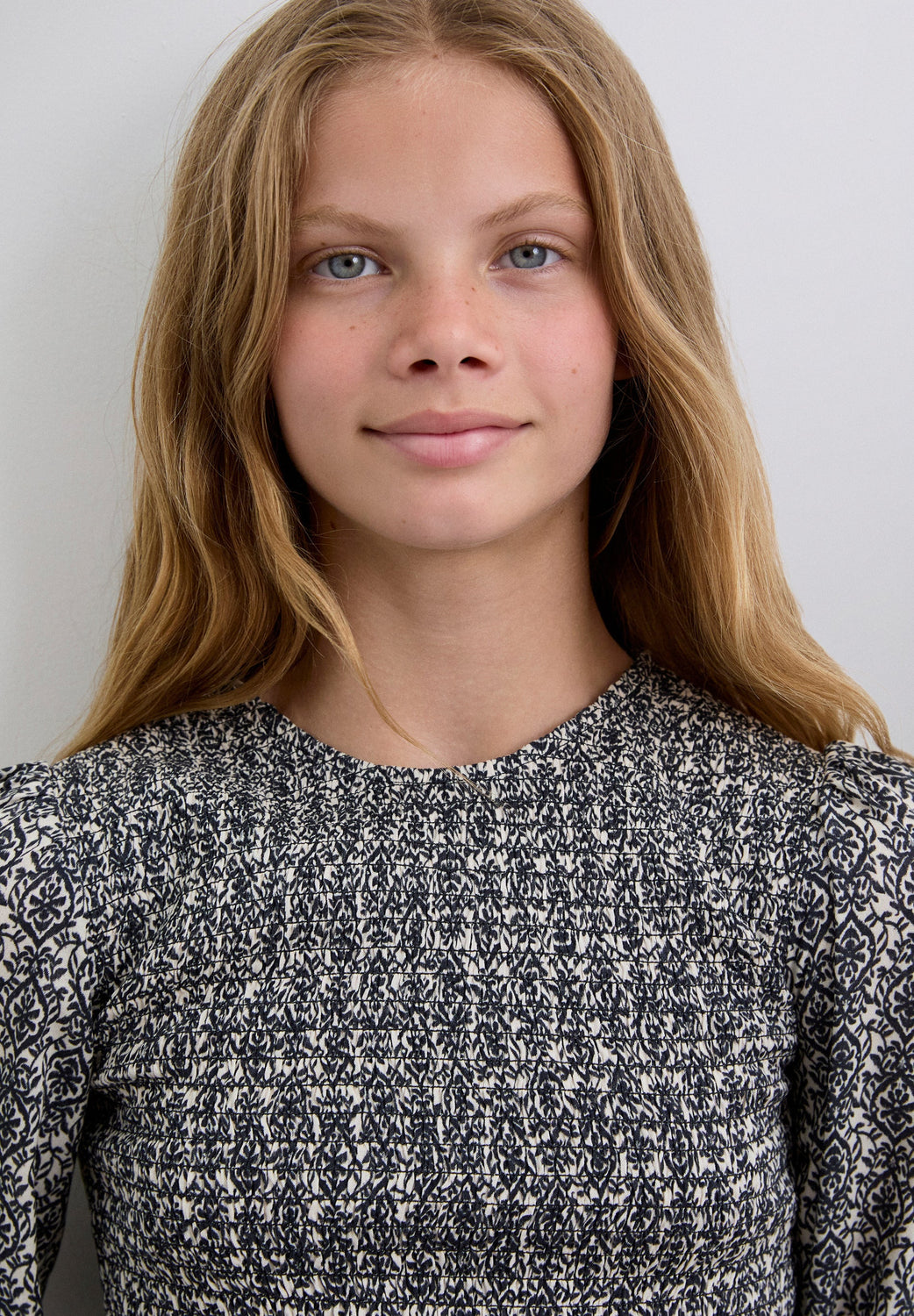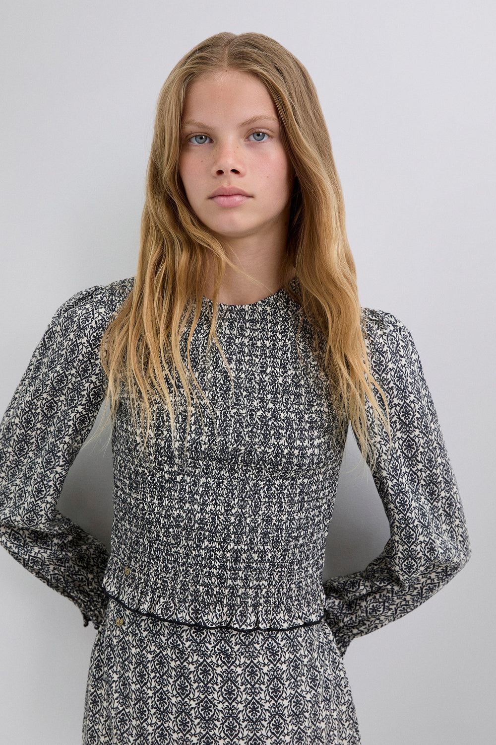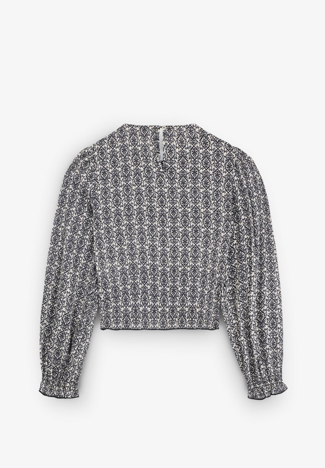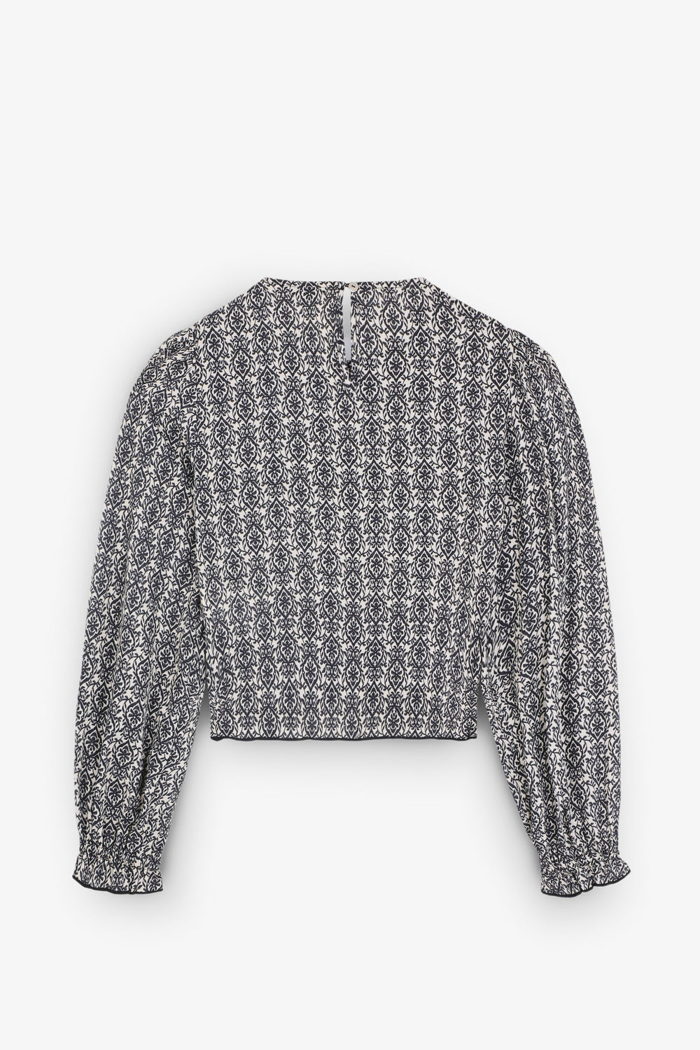 Blouse made of 100% viscose with smocking. Regular fit, round neck and back button fastening. Long sleeves with elasticated cuffs and ruffle on the hem.