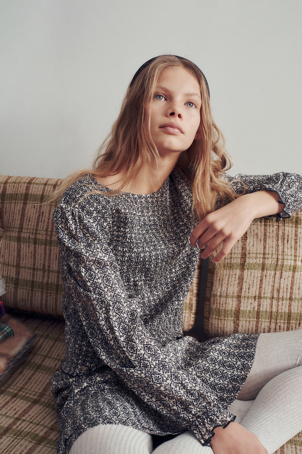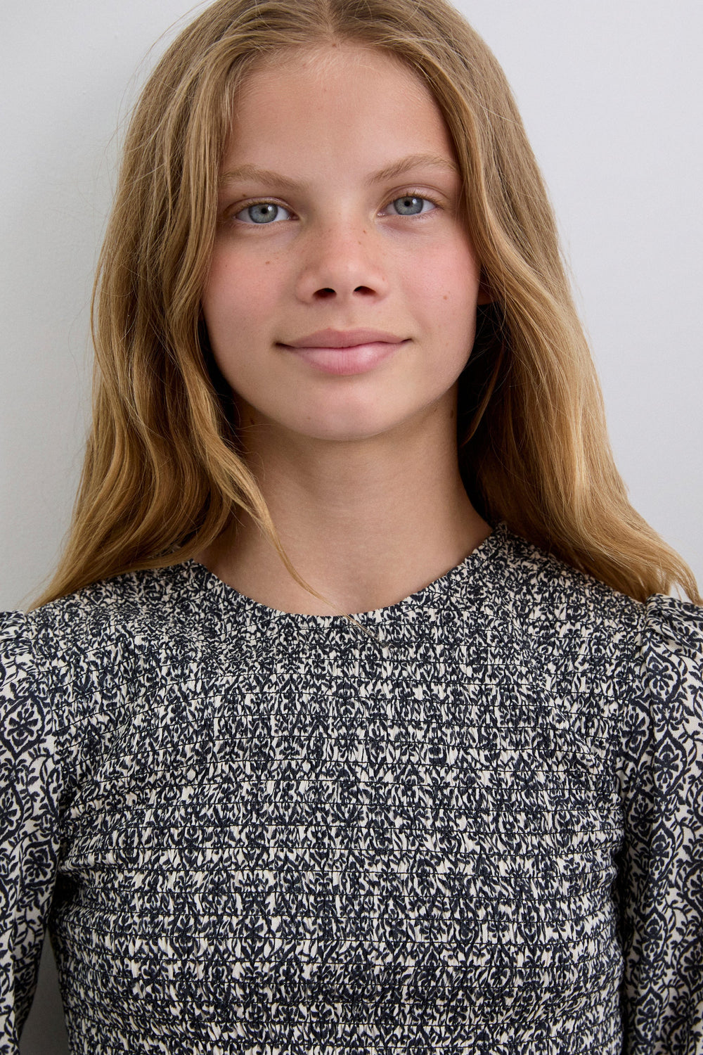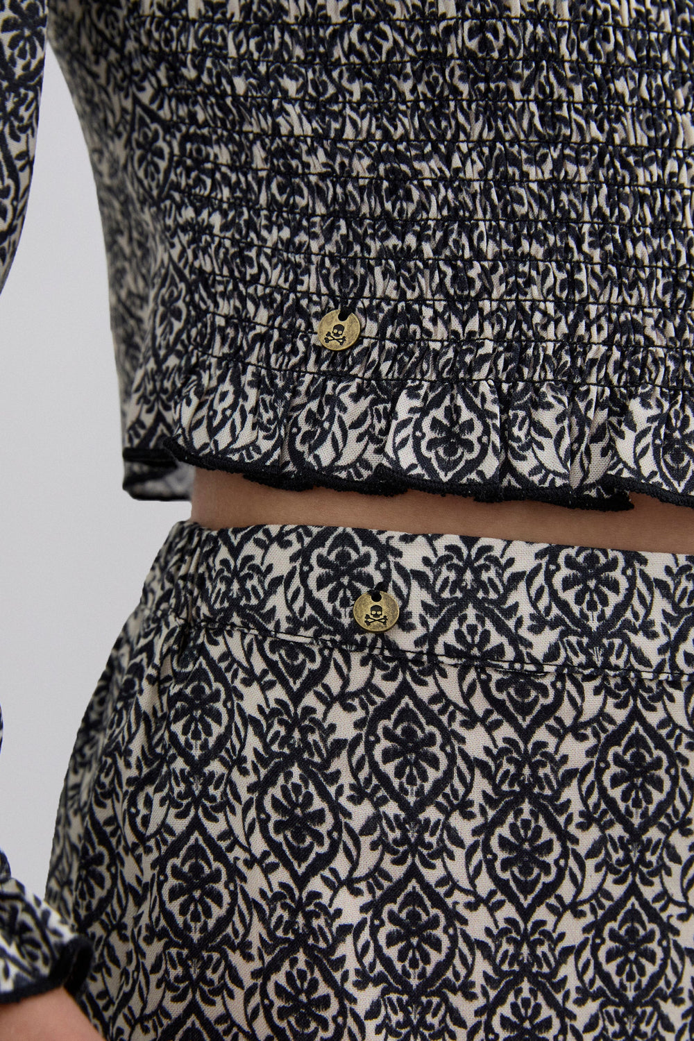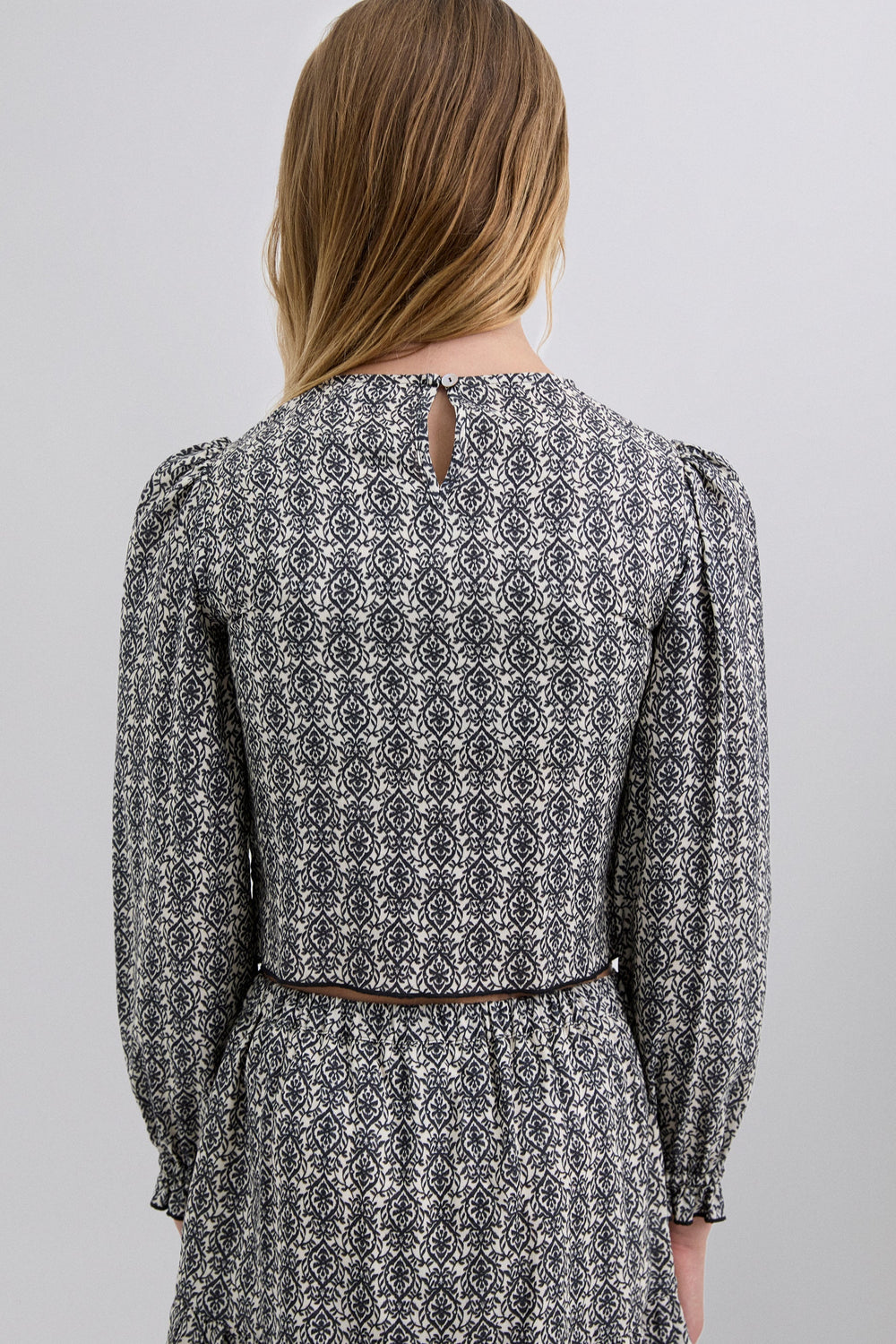Blouse made of 100% viscose with smocking. Regular fit, round neck and back button fastening. Long sleeves with elasticated cuffs and ruffle on the hem.