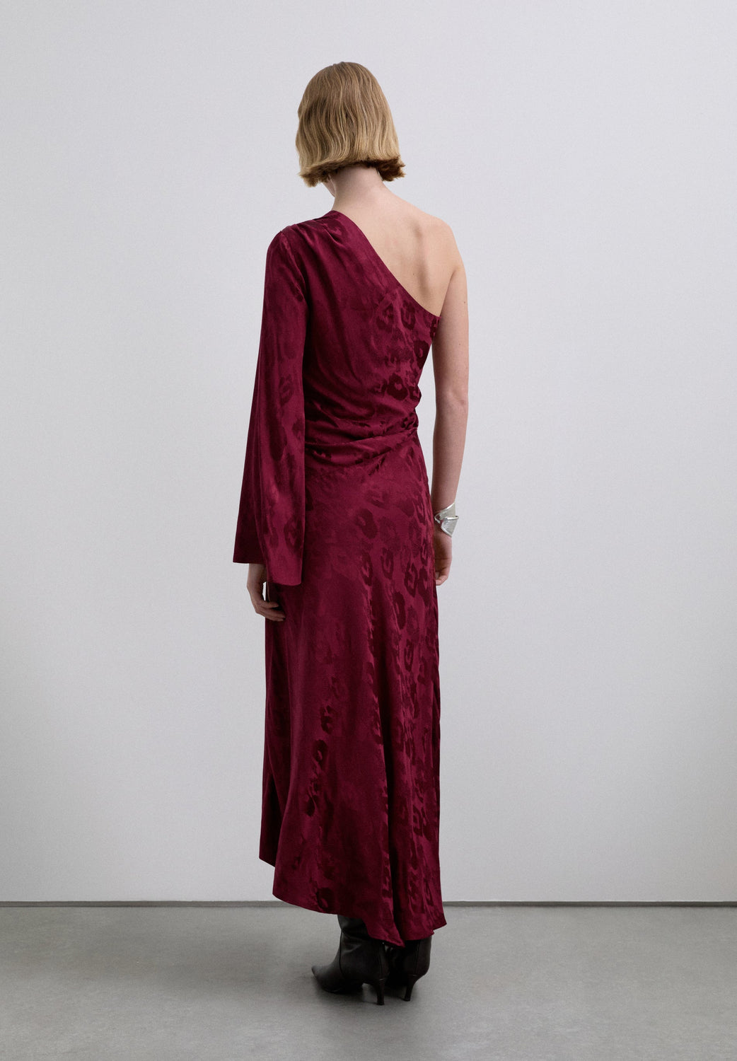 Satin asymmetric dress. Jacquard print. Long asymmetric sleeve- Flowing asymmetric hem.