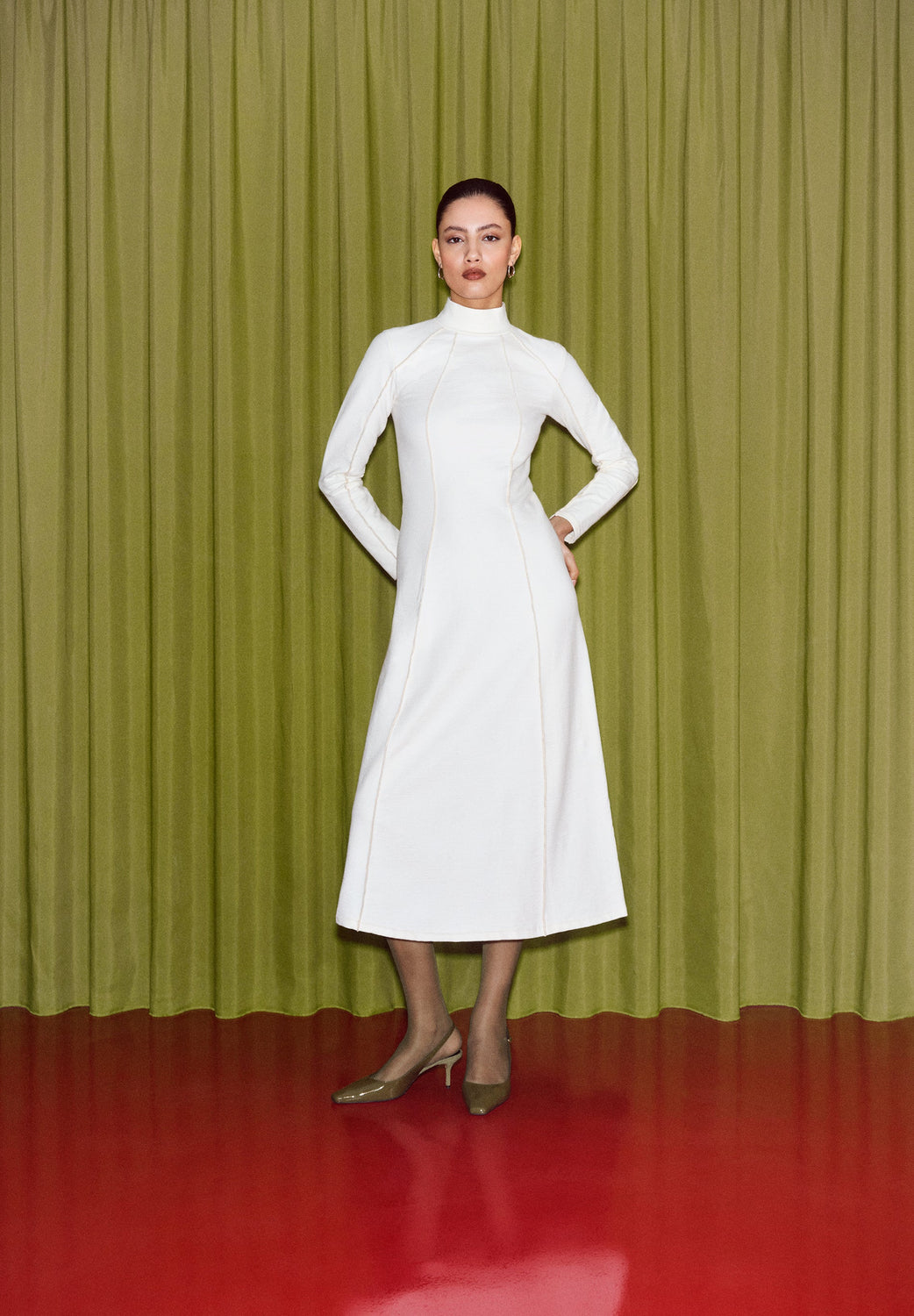 Knit midi dress made of BCI cotton. Long sleeves. High neck. Overlock stitch.