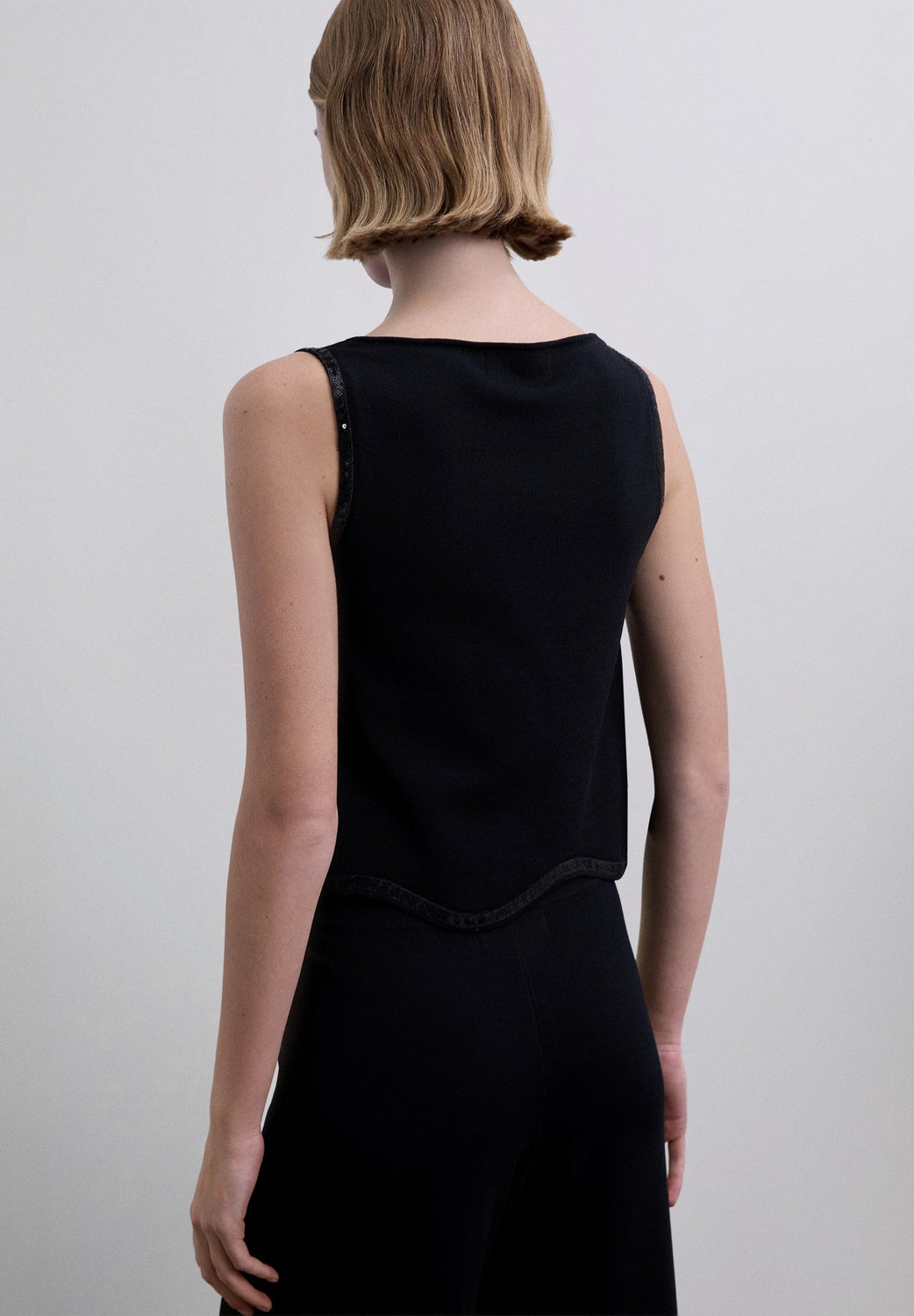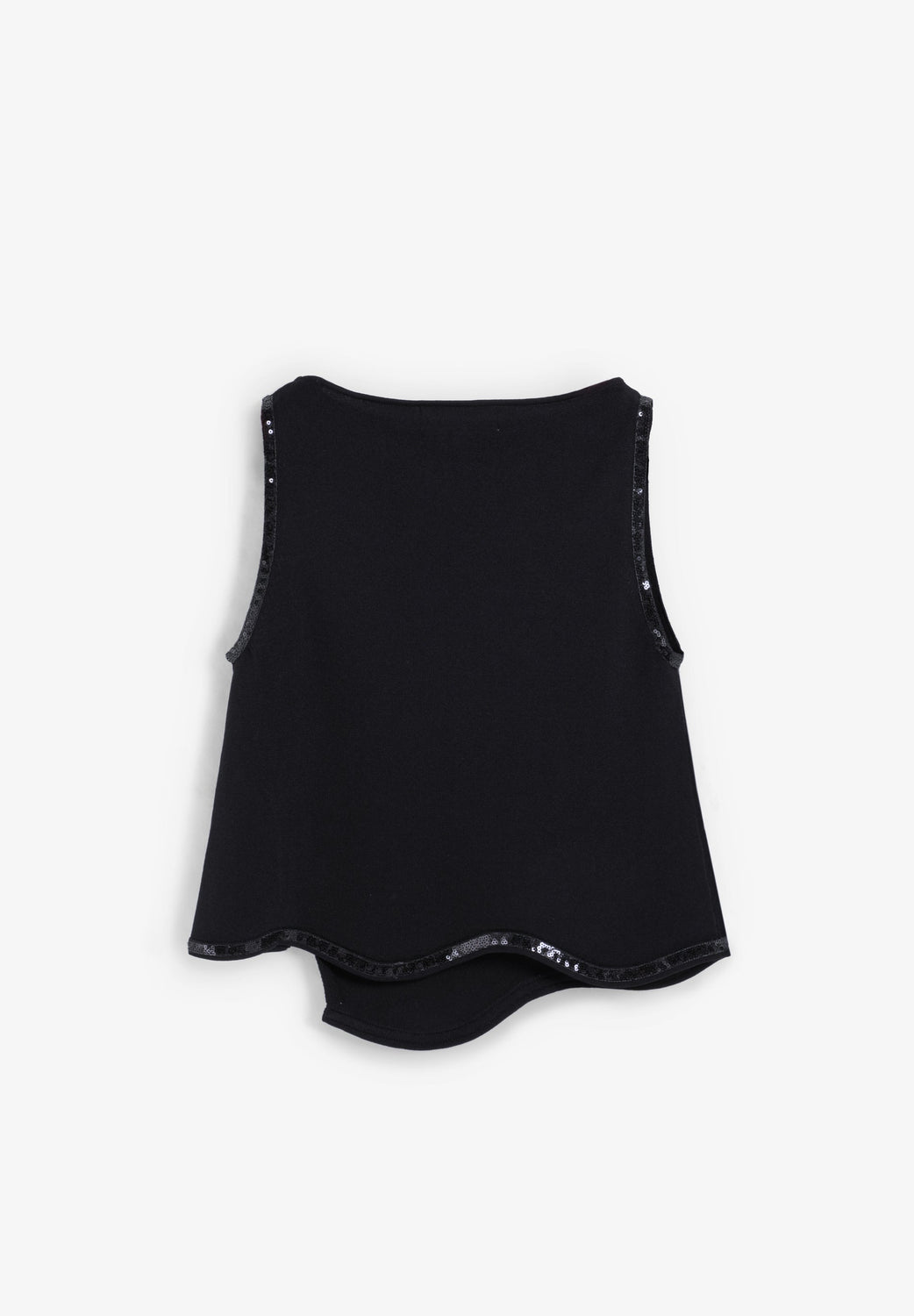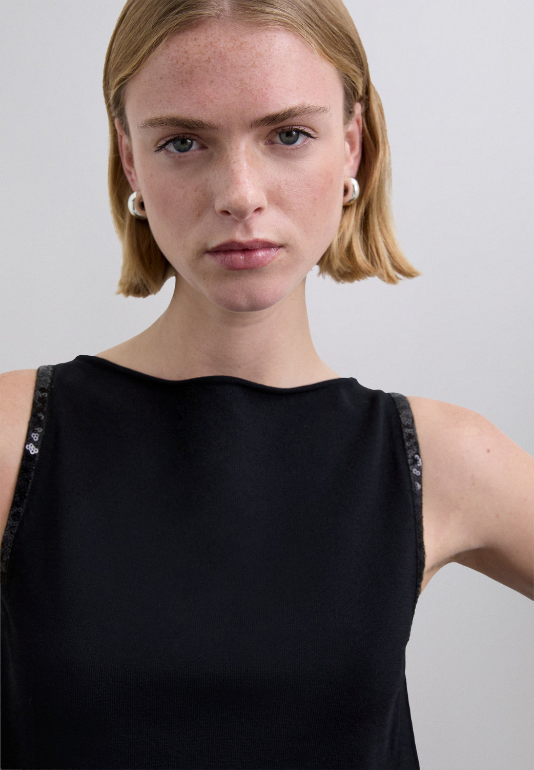 Top made of slightly stretchy knit fabric. Regular fit. Round neck. Sleeveless design. Sequinned detailing. Waved hem and side slit.